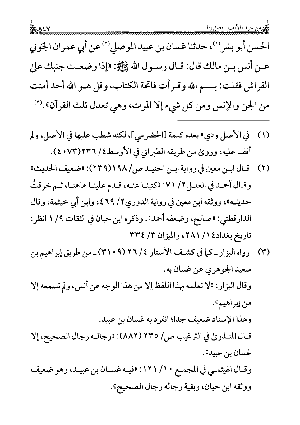 الحسن أبو بشر (¬١)، حدثنا غسان بن عبيد الموصلي (¬٢) عن أبي عمران الجوني عن أنس بن مالك قال: قال رسول الله - صلى الله عليه وسلم -: "إذا وضعت جنبك على الفراش فقلت: بسم الله وقرأت فاتحة الكتاب، وقل هو الله أحد أمنت من الجن والإنس ومن كل شيء إلا الموت، وهي تعدل ثلث القرآن". (¬٣)