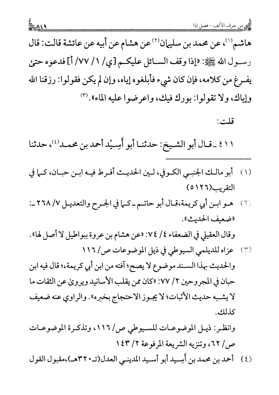 هاشم (¬١)، عن محمد بن سليمان (¬٢) عن هشام عن أبيه عن عائشة قالت: قال رسول الله - صلى الله عليه وسلم -: "إذا وقف السائل عليكم فدعوه حتى يفرغ من كلامه، فإن كان شيء فأبلغوه إياه، وإن لم يكن فقولوا: رزقنا الله وإياك، ولا تقولوا: بورك فيك، واعرضوا عليه الماء". (¬٣)