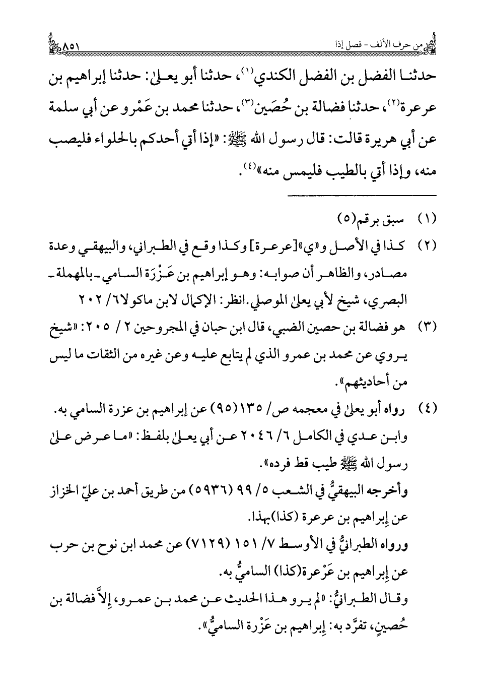 حدثنا الفضل بن الفضل الكندي (¬١)، حدثنا أبو يعلى: حدثنا إبراهيم بن عرعرة (¬٢)، حدثنا فضالة بن حُصَين (¬٣)، حدثنا محمد بن عَمْرو عن أبي سلمة عن أبي هريرة قالت: قال رسول الله - صلى الله عليه وسلم -: "إذا أتي أحدكم بالحلواء فليصب منه، وإذا أتي بالطيب فليمس منه" (¬٤).