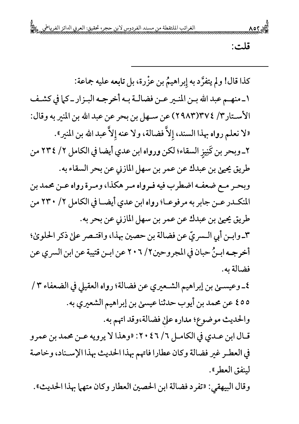 ١ - منهم عبد الله بن المنير عن فضالة به أخرجه البزار - كما في كشف الأستار ٣/ ٣٧٤ (٢٩٨٣) عن سهل بن بحر عن عبد الله بن المنير به وقال: "لا نعلم رواه بهذا السند، إِلَّا فضالة، ولا عنه إِلَّا عبد الله بن المنير".