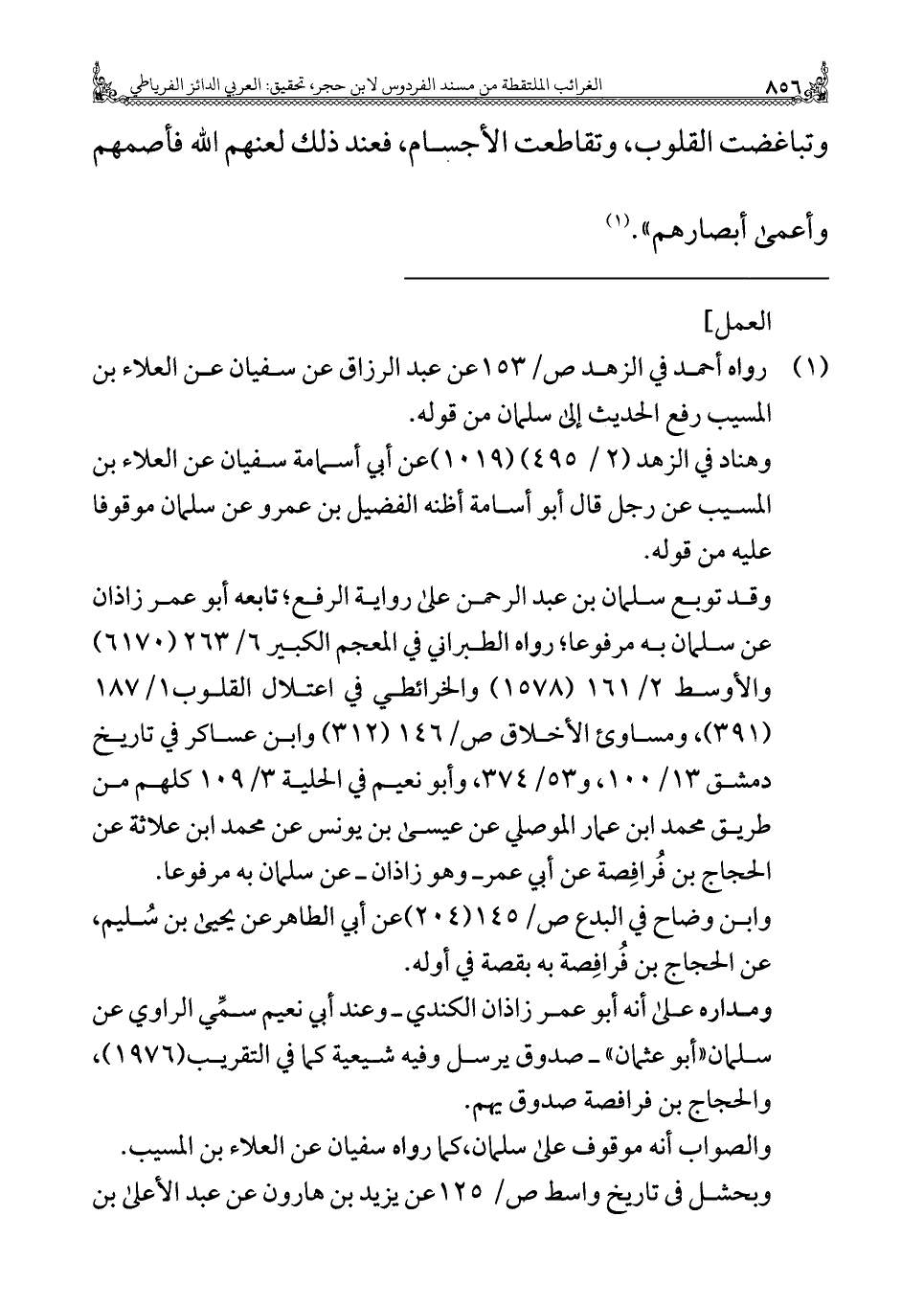 (¬١) رواه أحمد في الزهد ص/ ١٥٣ عن عبد الرزاق عن سفيان عن العلاء بن المسيب رفع الحديث إلى سلمان من قوله.