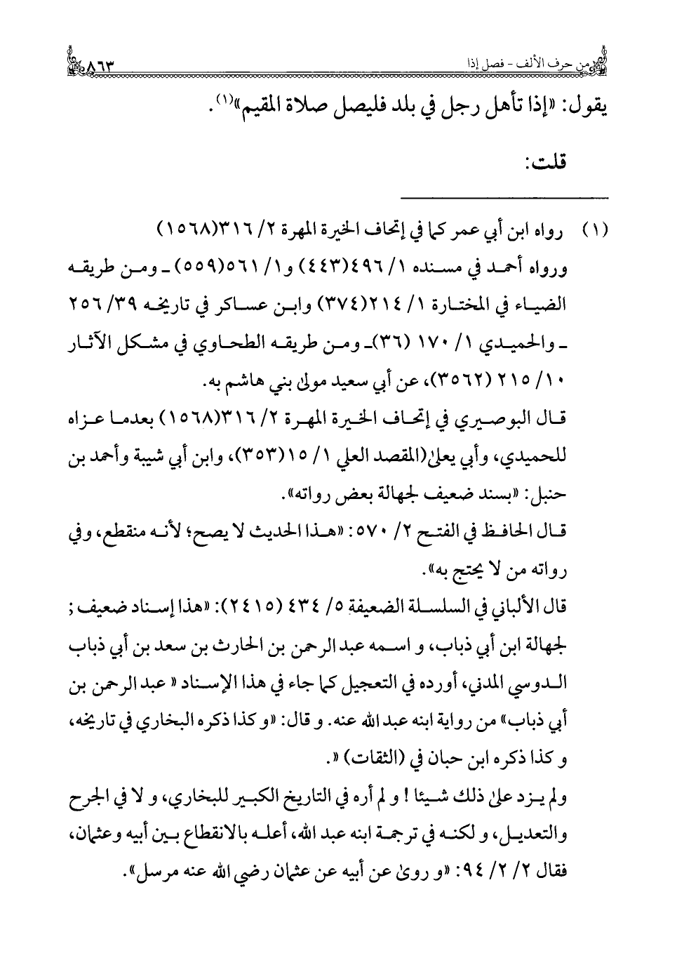 ولم يزد على ذلك شيئا! ولم أره في التاريخ الكبير للبخاري، ولا في الجرح والتعديل، ولكنه في ترجمة ابنه عبد الله، أعله بالانقطاع بين أبيه وعثمان، فقال ٢/ ٢/ ٩٤: "وروى عن أبيه عن عثمان رضي الله عنه مرسل".