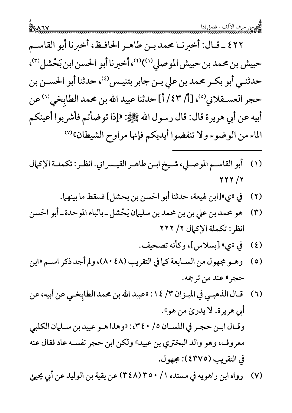 ٤٢٢ - قال: أخبرنا محمد بن طاهر الحافظ، أخبرنا أبو القاسم حبيش بن محمد بن حبيش الموصلي) (¬١) (¬٢)، أخبرنا أبو الحسن ابن بَحْشل (¬٣)، حدثني أبو بكر محمد بن علي بن جابر بتنيس (¬٤)، حدثنا أبو الحسن بن حجر العسقلاني (¬٥)، حدثنا عبيد الله بن محمد الطابِخي (¬٦) عن أبيه عن أبي هريرة قال: قال رسول الله - صلى الله عليه وسلم -: "إذا توضأتم فأشربوا أعينكم الماء من الوضوء ولا تنفضوا أيديكم فإنها مراوح الشيطان" (¬٧)