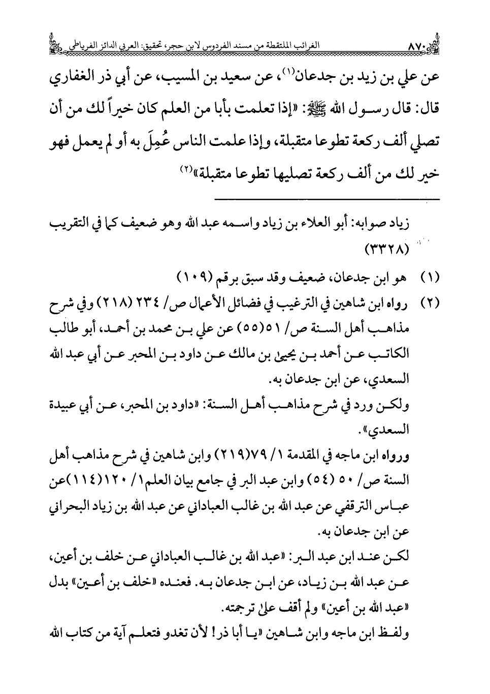 ورواه ابن ماجه في المقدمة ١/ ٧٩ (٢١٩) وابن شاهين في شرح مذاهب أهل السنة ص/ ٥٠ (٥٤) وابن عبد البر في جامع بيان العلم ١/ ١٢٠ (١١٤) عن عباس الترقفي عن عبد الله بن غالب العباداني عن عبد الله بن زياد البحراني عن ابن جدعان به.