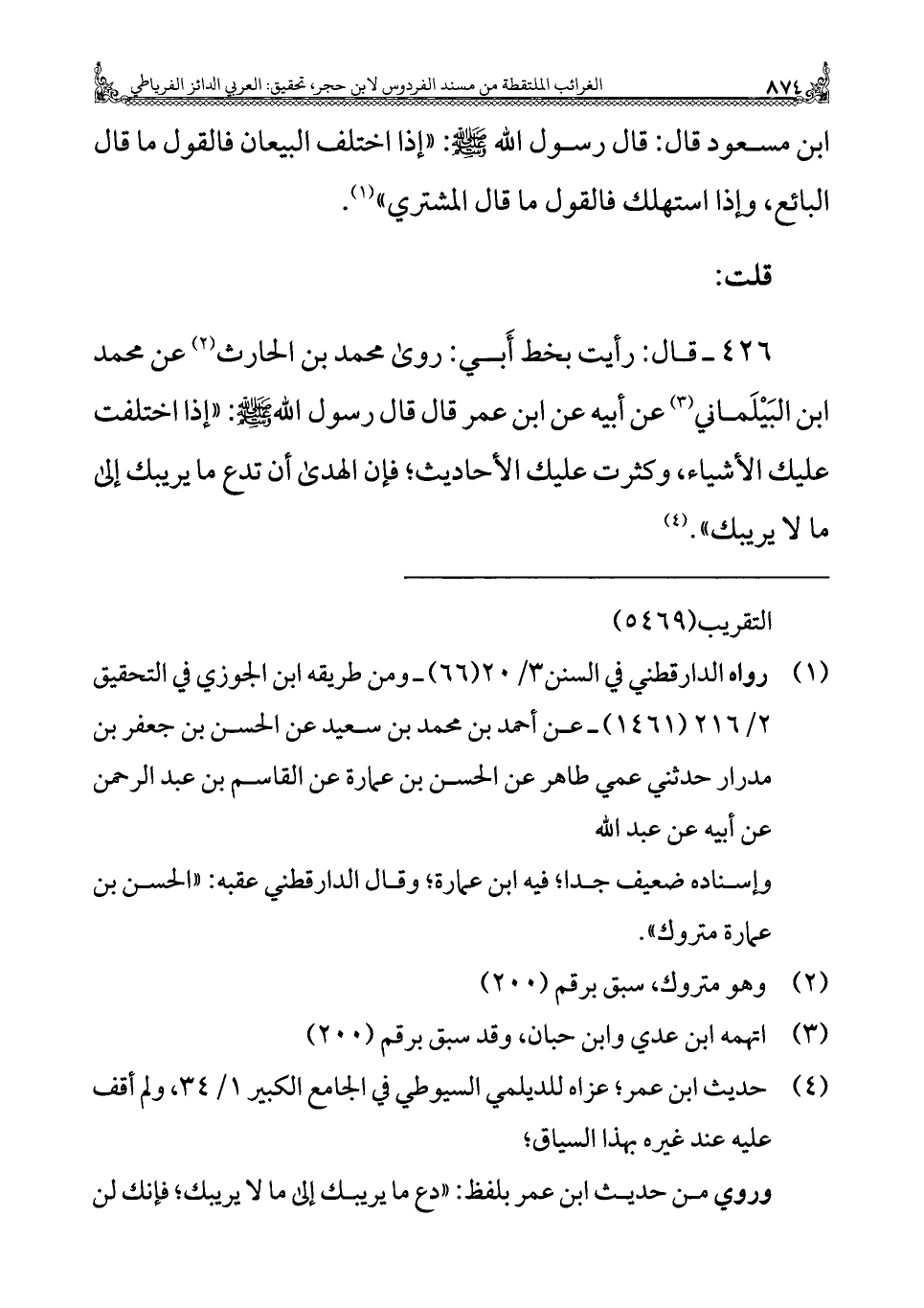 ٤٢٦ - قال: رأيت بخط أَبي: روى محمد بن الحارث (¬٢) عن محمد ابن البَيْلَماني (¬٣) عن أبيه عن ابن عمر قال قال رسول الله - صلى الله عليه وسلم -: "إذا اختلفت عليك الأشياء، وكثرت عليك الأحاديث؛ فإن الهدى أن تدع ما يريبك إلى ما لا يريبك". (¬٤)