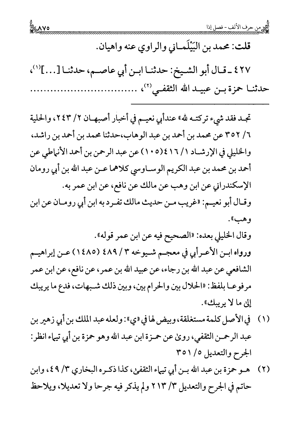 (¬٢) هو حمزة بن عبد الله بن أبي تيماء الثقفي، كذا ذكره البخاري ٣/ ٤٩، وابن حاتم في الجرح والتعديل ٣/ ٢١٣ ولم يذكر فيه جرحا ولا تعديلا، ويلاحظ =
