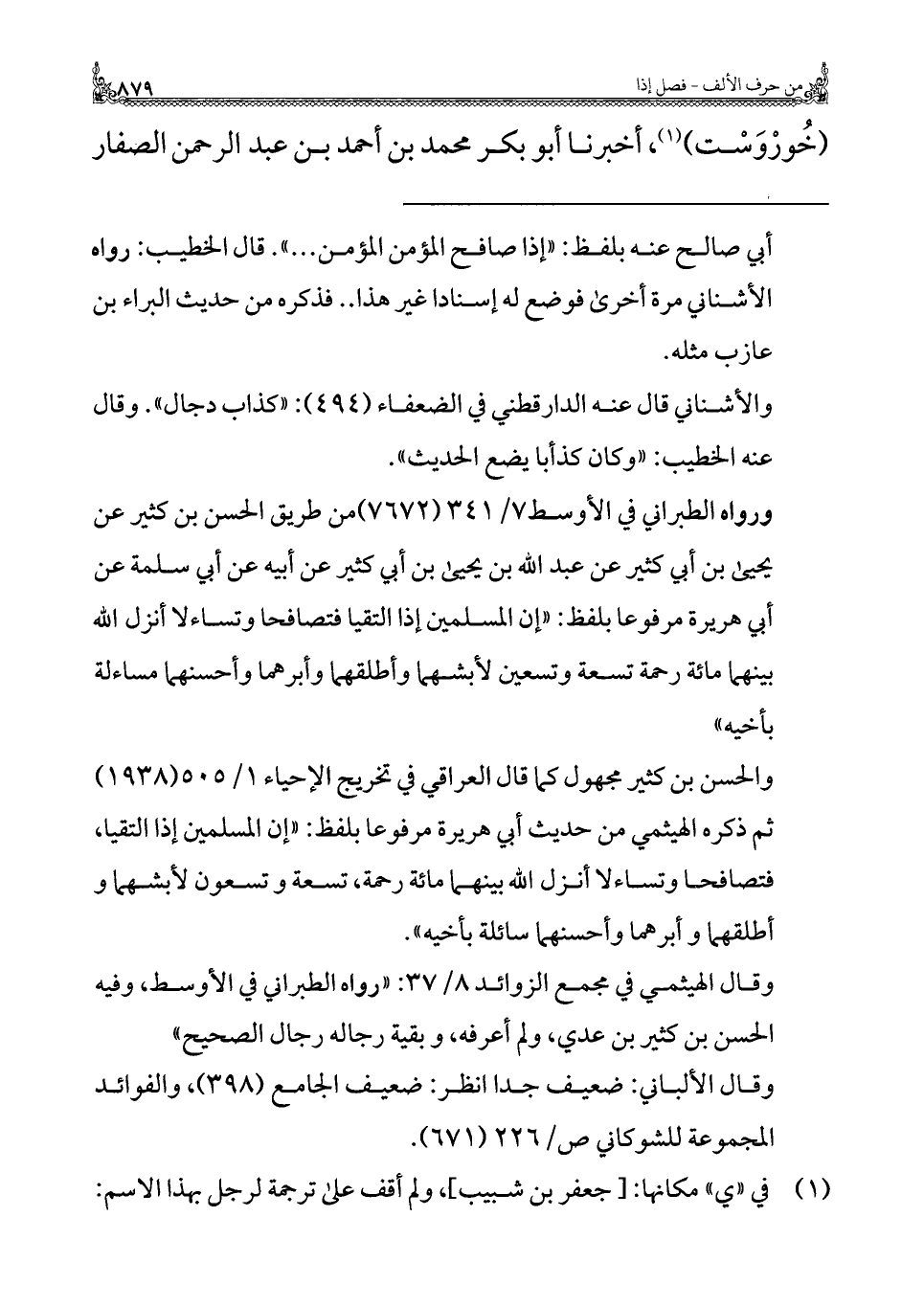 = أبي صالح عنه بلفظ: "إذا صافح المؤمن المؤمن ... ". قال الخطيب: رواه الأشناني مرة أخرى فوضع له إسنادا غير هذا. . فذكره من حديث البراء بن عازب مثله.