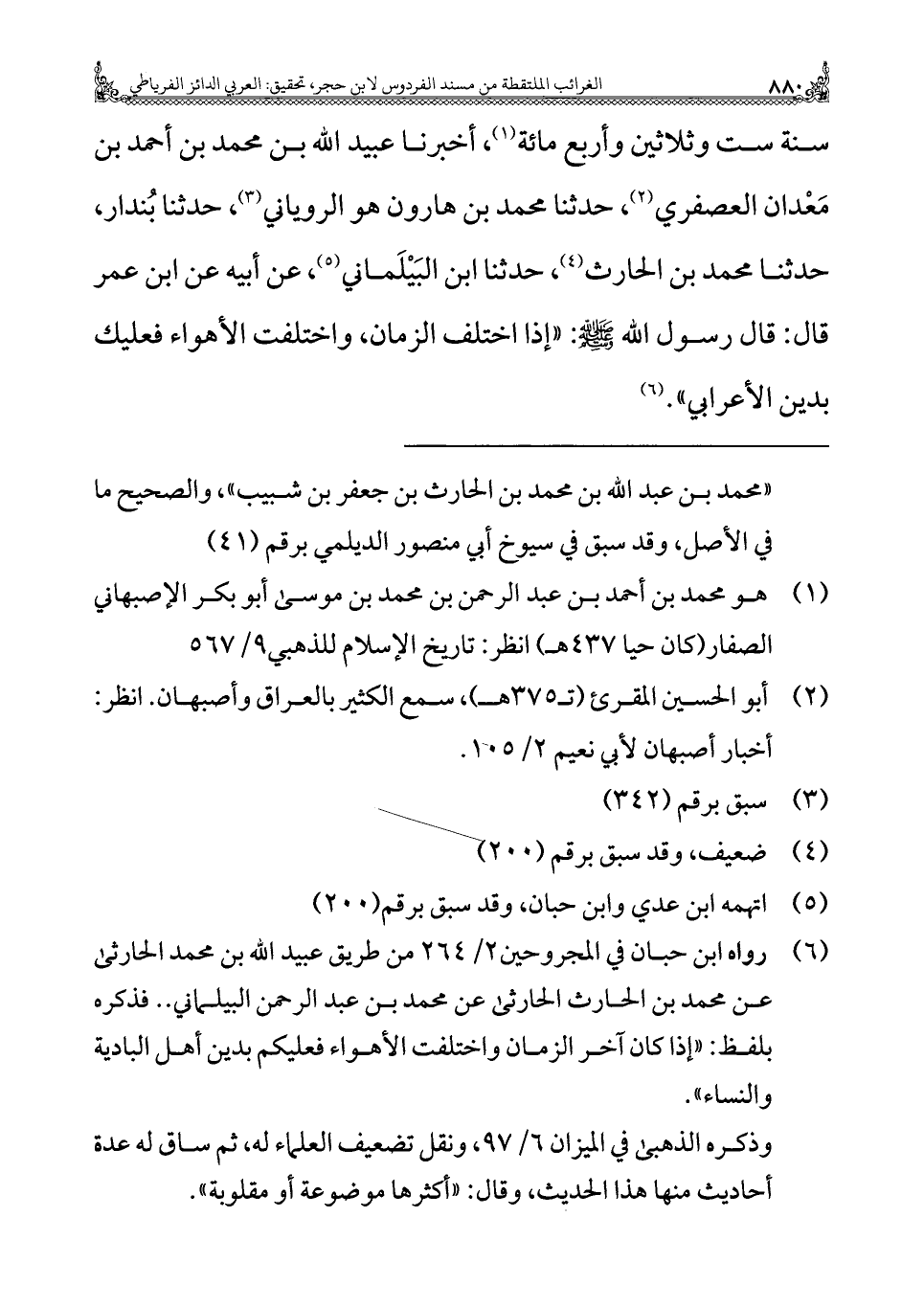 سنة ست وثلاثين وأربع مائة (¬١)، أخبرنا عبيد الله بن محمد بن أحمد بن مَعْدان العصفري (¬٢)، حدثنا محمد بن هارون هو الروياني (¬٣)، حدثنا بُندار، حدثنا محمد بن الحارث (¬٤)، حدثنا ابن البَيْلَماني (¬٥)، عن أبيه عن ابن عمر قال: قال رسول الله - صلى الله عليه وسلم -: "إذا اختلف الزمان، واختلفت الأهواء فعليك بدين الأعرابي". (¬٦)