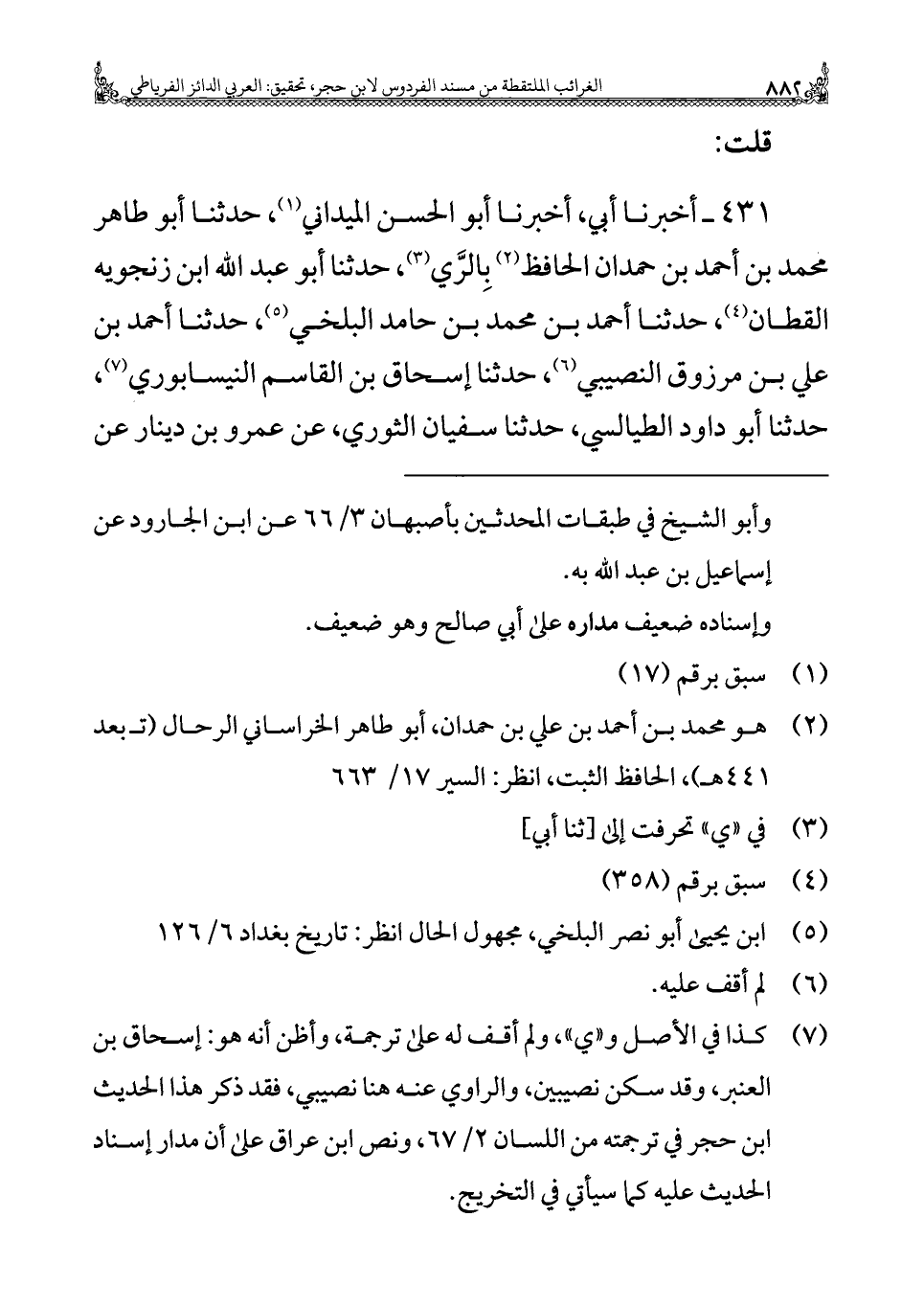 ٤٣١ - أخبرنا أبي، أخبرنا أبو الحسن الميداني (¬١)، حدثنا أبو طاهر محمد بن أحمد بن حمدان الحافظ (¬٢) بِالرَّي (¬٣)، حدثنا أبو عبد الله ابن زنجويه القطان (¬٤)، حدثنا أحمد بن محمد بن حامد البلخي (¬٥)، حدثنا أحمد بن علي بن مرزوق النصيبي (¬٦)، حدثنا إسحاق بن القاسم النيسابوري (¬٧)، حدثنا أبو داود الطيالسي، حدثنا سفيان الثوري، عن عمرو بن دينار عن