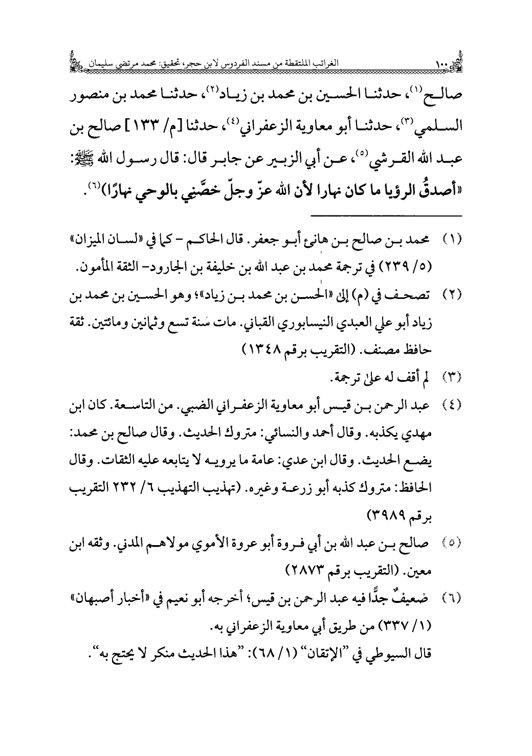 صالح (¬١)، حدثنا الحسين بن محمد بن زياد (¬٢)، حدثنا محمد بن منصور السلمي (¬٣)، حدثنا أبو معاوية الزعفراني (¬٤)، حدثنا صالح بن عبد الله القرشي (¬٥)، عن أبي الزبير عن جابر قال: قال رسول الله - صلى الله عليه وسلم -: "أصدقُ الرؤيا ما كان نهارا لأن الله عزّ وجلّ خصَّني بالوحي نهارًا) (¬٦).