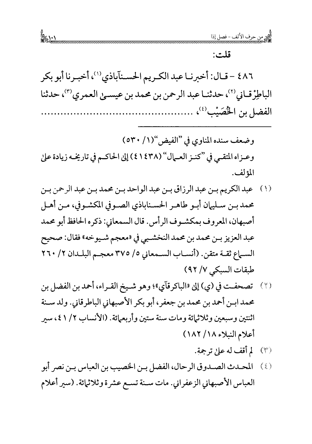 ٤٨٦ - قال: أخبرنا عبد الكريم الحسنآباذي (¬١)، أخبرنا أبو بكر الباطِرْقاني (¬٢)، حدثنا عبد الرحمن بن محمد بن عيسى العمري (¬٣)، حدثنا الفضل بن الخُصَيْب (¬٤)، ...