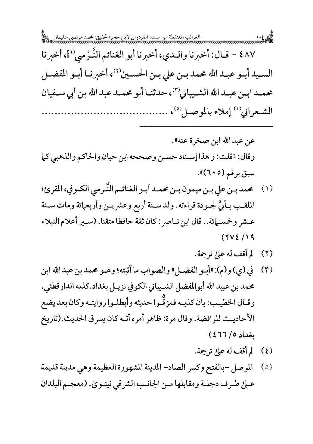 ٤٨٧ - قال: أخبرنا والدي، أخبرنا أبو الغنائم النَّرْسي (¬١)، أخبرنا السيد أبو عبد الله محمد بن علي بن الحسين (¬٢)، أخبرنا أبو المفضل محمد ابن عبد الله الشيباني (¬٣)، حدثنا أبو محمد عبد الله بن أبي سفيان الشعراني (¬٤) إملاء بالموصل (¬٥)، ....