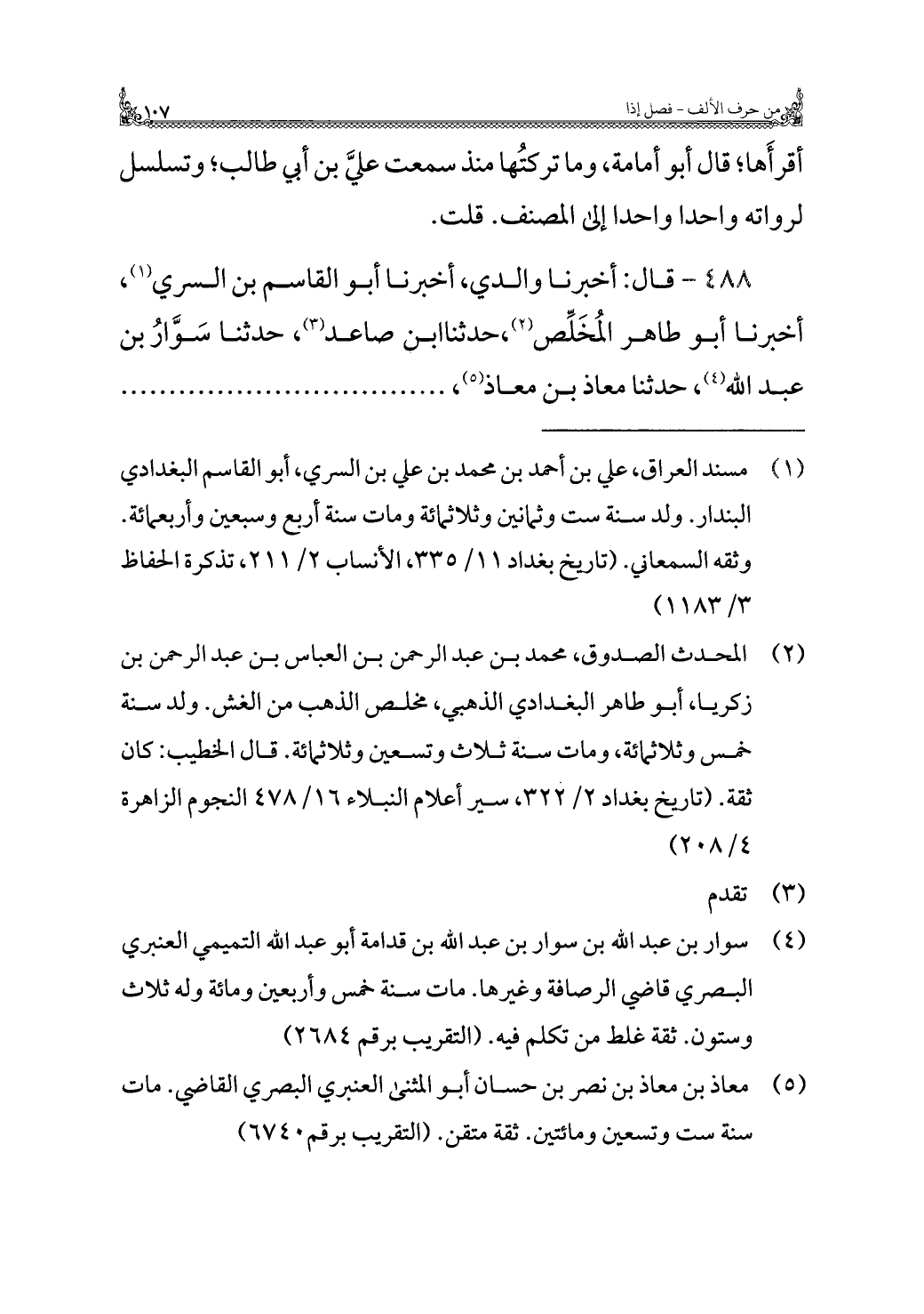 ٤٨٨ - قال: أخبرنا والدي، أخبرنا أبو القاسم بن السري (¬١)، أخبرنا أبو طاهر المُخَلِّص (¬٢)، حدثنا ابن صاعد (¬٣)، حدثنا سَوَّارُ بن عبد الله (¬٤)، حدثنا معاذ بن معاذ (¬٥)، ....