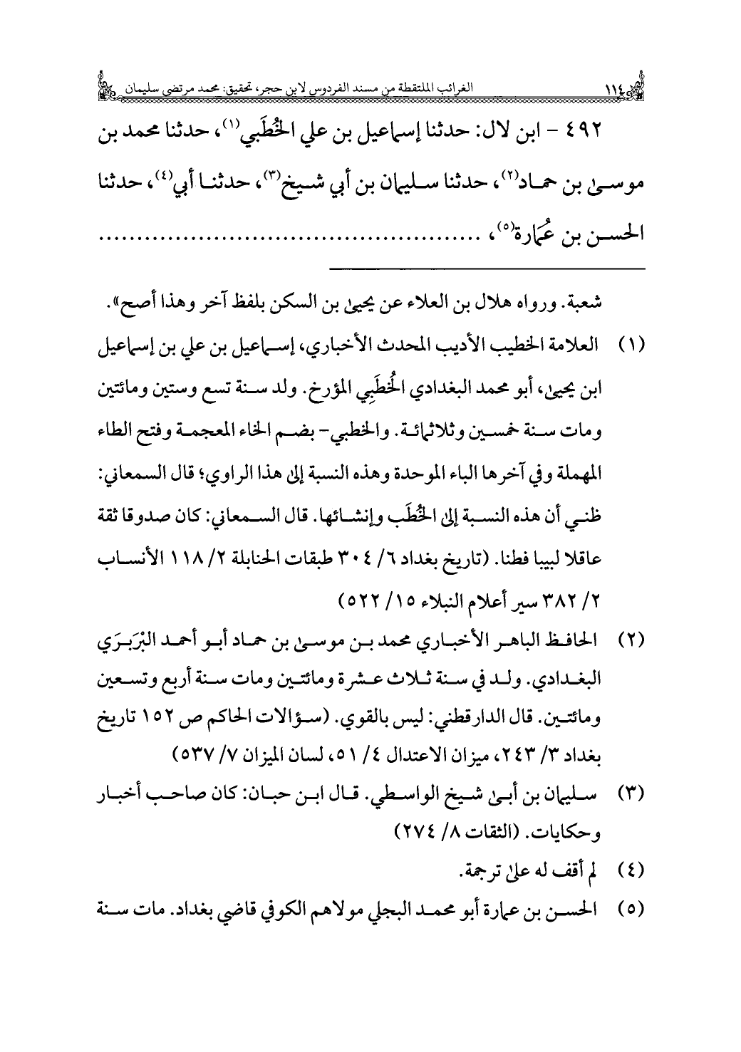 ٤٩٢ - ابن لال: حدثنا إسماعيل بن علي الخُطَبي (¬١)، حدثنا محمد بن موسى بن حماد (¬٢)، حدثنا سليمان بن أبي شيخ (¬٣)، حدثنا أبي (¬٤)، حدثنا الحسن بن عُمَارة (¬٥)،