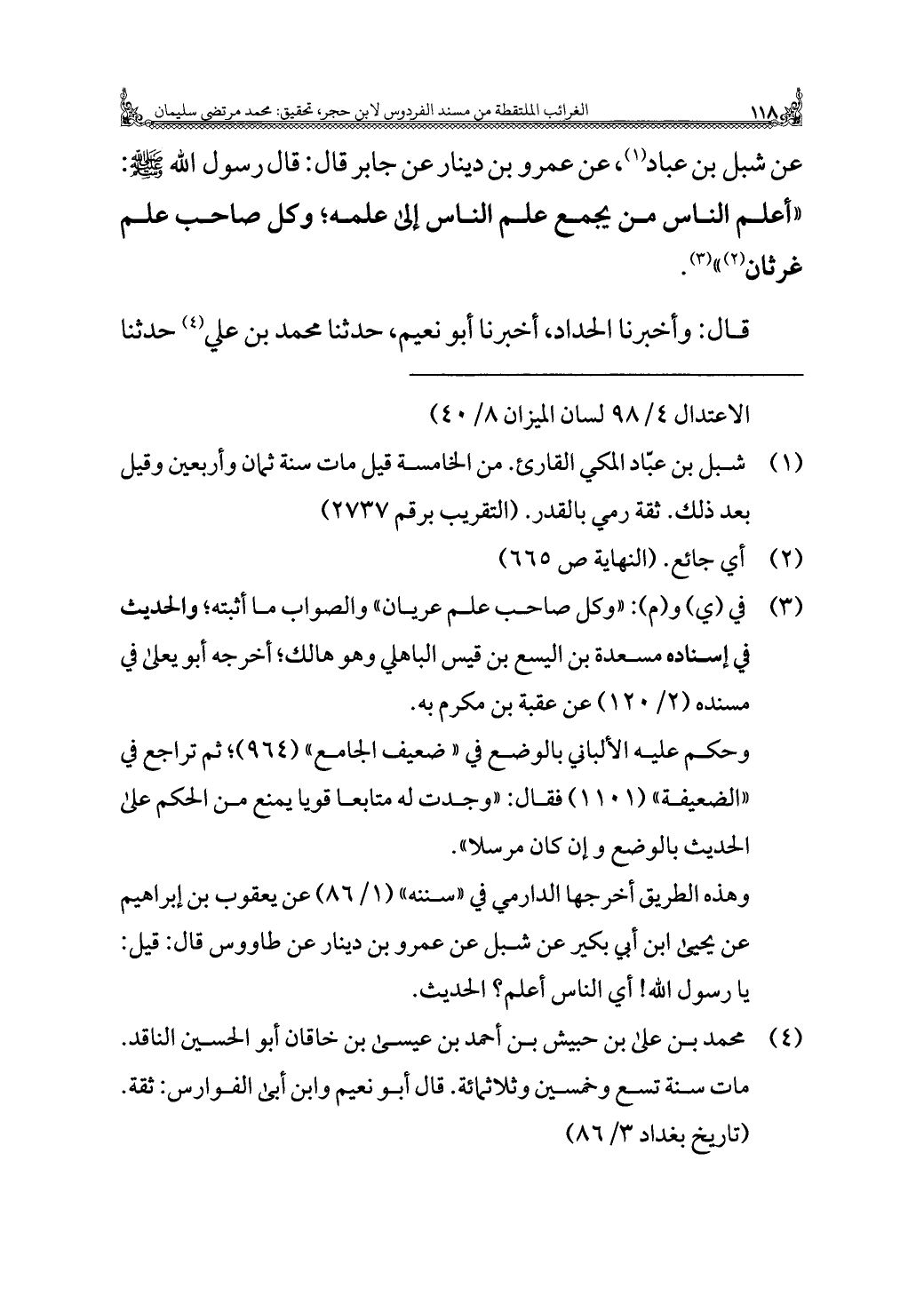 عن شبل بن عباد (¬١)، عن عمرو بن دينار عن جابر قال: قال رسول الله - صلى الله عليه وسلم -: "أعلم الناس من يجمع علم الناس إلى علمه؛ وكل صاحب علم غرثان (¬٢) " (¬٣).