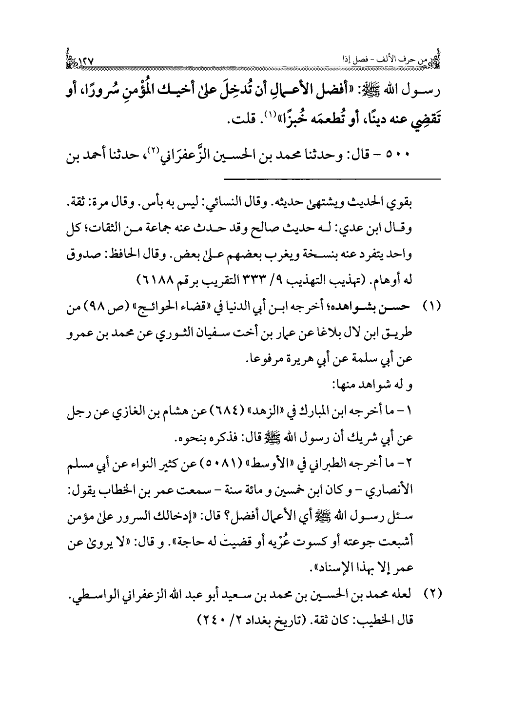 ٢ - ما أخرجه الطبراني في "الأوسط" (٥٠٨١) عن كثير النواء عن أبي مسلم الأنصاري - وكان ابن خمسين ومائة سنة - سمعت عمر بن الخطاب يقول: سئل رسول الله - صلى الله عليه وسلم - أي الأعمال أفضل؟ قال: "إدخالك السرور على مؤمن أشبعت جوعته أو كسوت عُرْيه أو قضيت له حاجة". وقال: "لا يروى عن عمر إلا بهذا الإسناد".