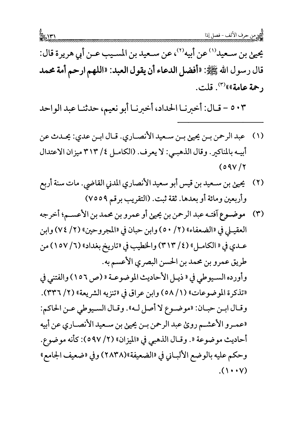 (¬١) عبد الرحمن بن يحيى بن سعيد الأنصاري. قال ابن عدي: يحدث عن أبيه بالمناكير. وقال الذهبي: لا يعرف. (الكامل ٤/ ٣١٣ ميزان الاعتدال ٢/ ٥٩٧)