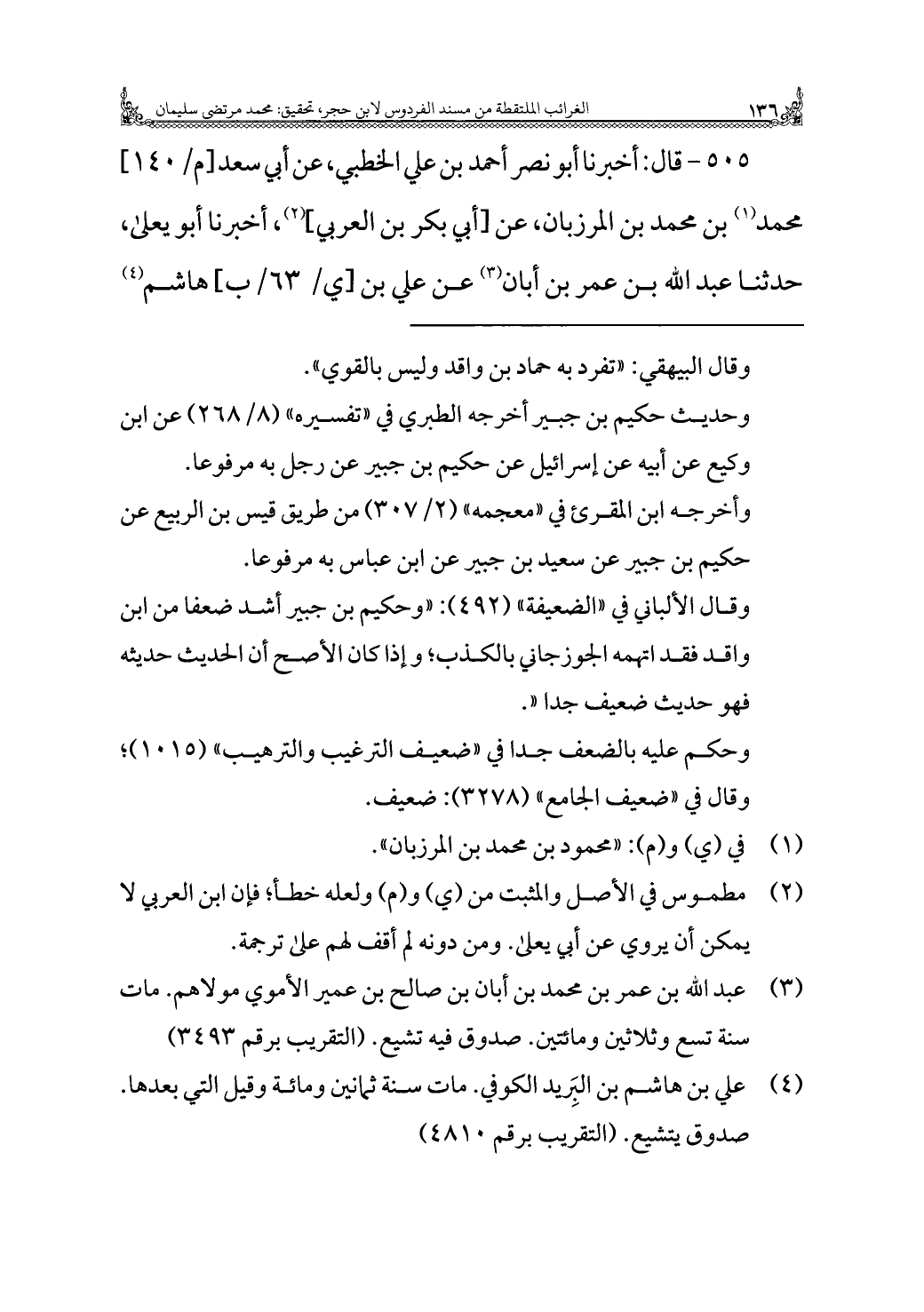 ٥٠٥ - قال: أخبرنا أبو نصر أحمد بن علي الخطبي، عن أبي سعد محمد (¬١) بن محمد بن المرزبان، عن [أبي بكر بن العربي] (¬٢)، أخبرنا أبو يعلى، حدثنا عبد الله بن عمر بن أبان (¬٣) عن علي بن هاشم (¬٤)