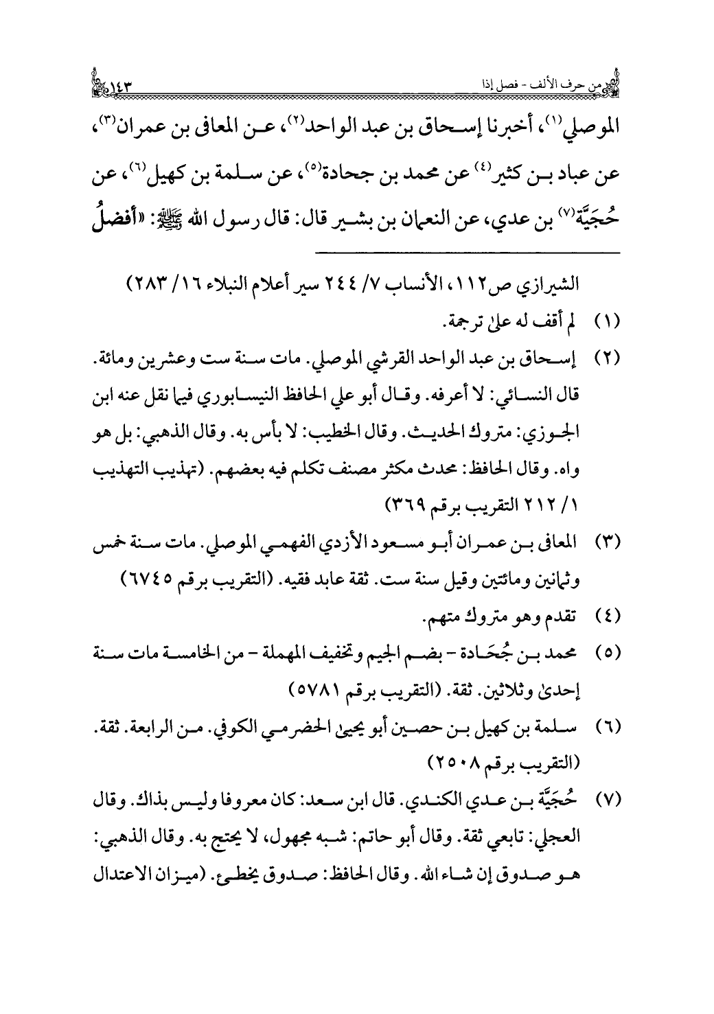 الموصلي (¬١)، أخبرنا إسحاق بن عبد الواحد (¬٢)، عن المعافى بن عمران (¬٣)، عن عباد بن كثير (¬٤) عن محمد بن جحادة (¬٥)، عن سلمة بن كهيل (¬٦)، عن حُجَيَّة (¬٧) بن عدي، عن النعمان بن بشير قال: قال رسول الله - صلى الله عليه وسلم -: "أفضلُ