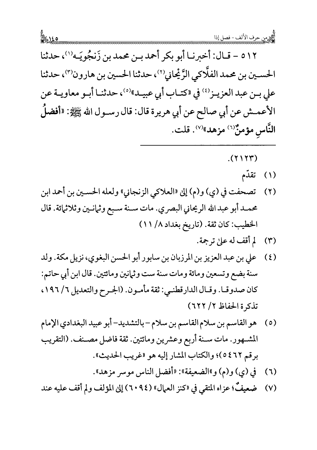 ٥١٢ - قال: أخبرنا أبو بكر أحمد بن محمد بن زَنجُويَه (¬١)، حدثنا الحسين بن محمد الفلَّاكي الرَّيْحاني (¬٢)، حدثنا الحسين بن هارون (¬٣)، حدثنا علي بن عبد العزيز (¬٤) في "كتاب أبي عبيد" (¬٥)، حدثنا أبو معاوية عن الأعمش عن أبي صالح عن أبي هريرة قال: قال رسول الله - صلى الله عليه وسلم -: "أفضلُ النَّاسِ مؤمنٌ (¬٦) مزهد" (¬٧). قلت.