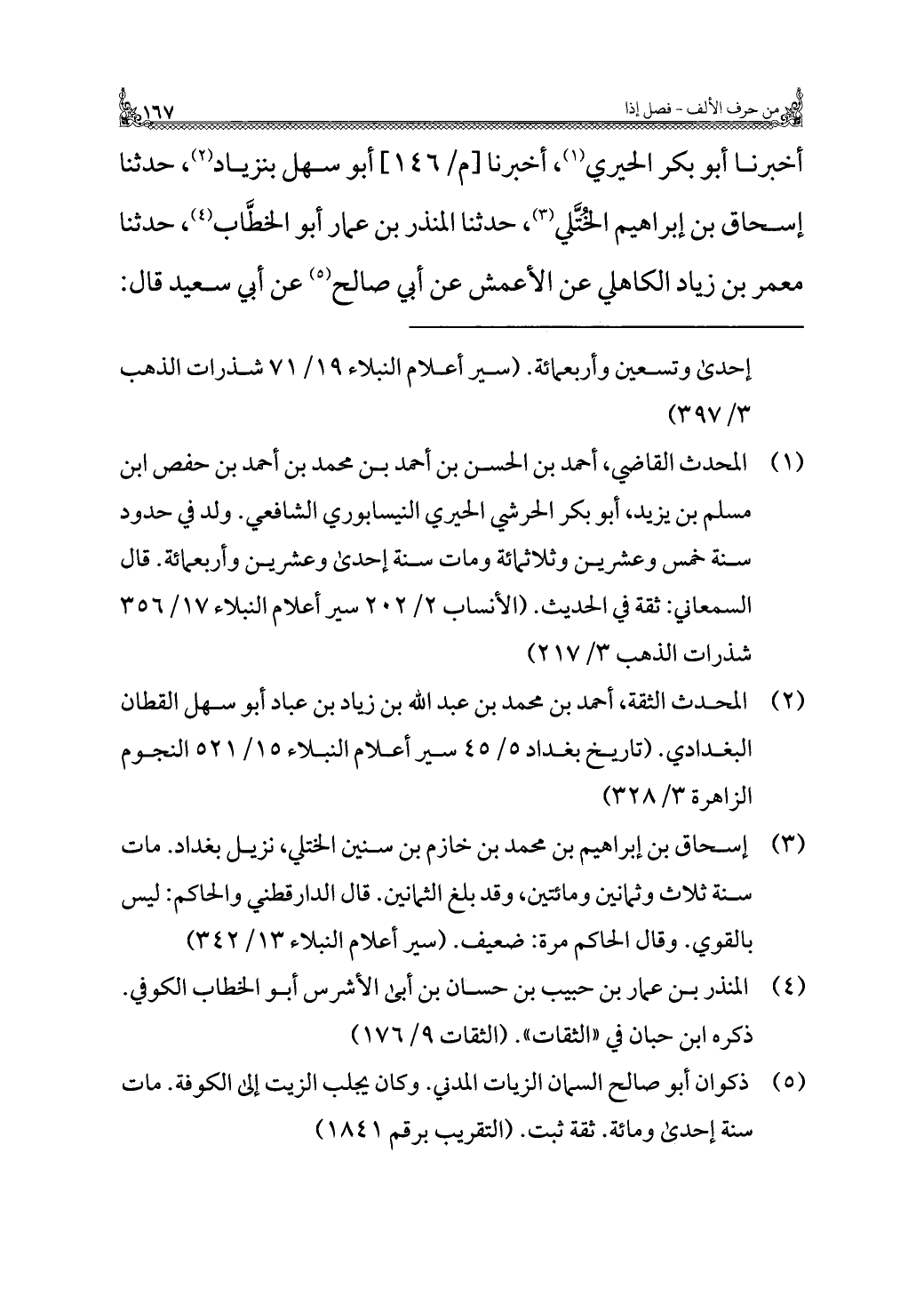 أخبرنا أَبُو بكر الحيري (¬١)، أخبرنا أَبُو سهل بنزياد (¬٢)، حَدَّثَنَا إسحاق بن إبْرَاهِيم الخُتَّلي (¬٣)، حَدَّثَنَا المنذر بن عمار أَبُو الخطَّاب (¬٤)، حَدَّثَنَا مَعْمَر بن زياد الكاهلي عن الأَعْمَش عن أَبِي صالح (¬٥) عن أَبِي سَعِيد قَالَ: