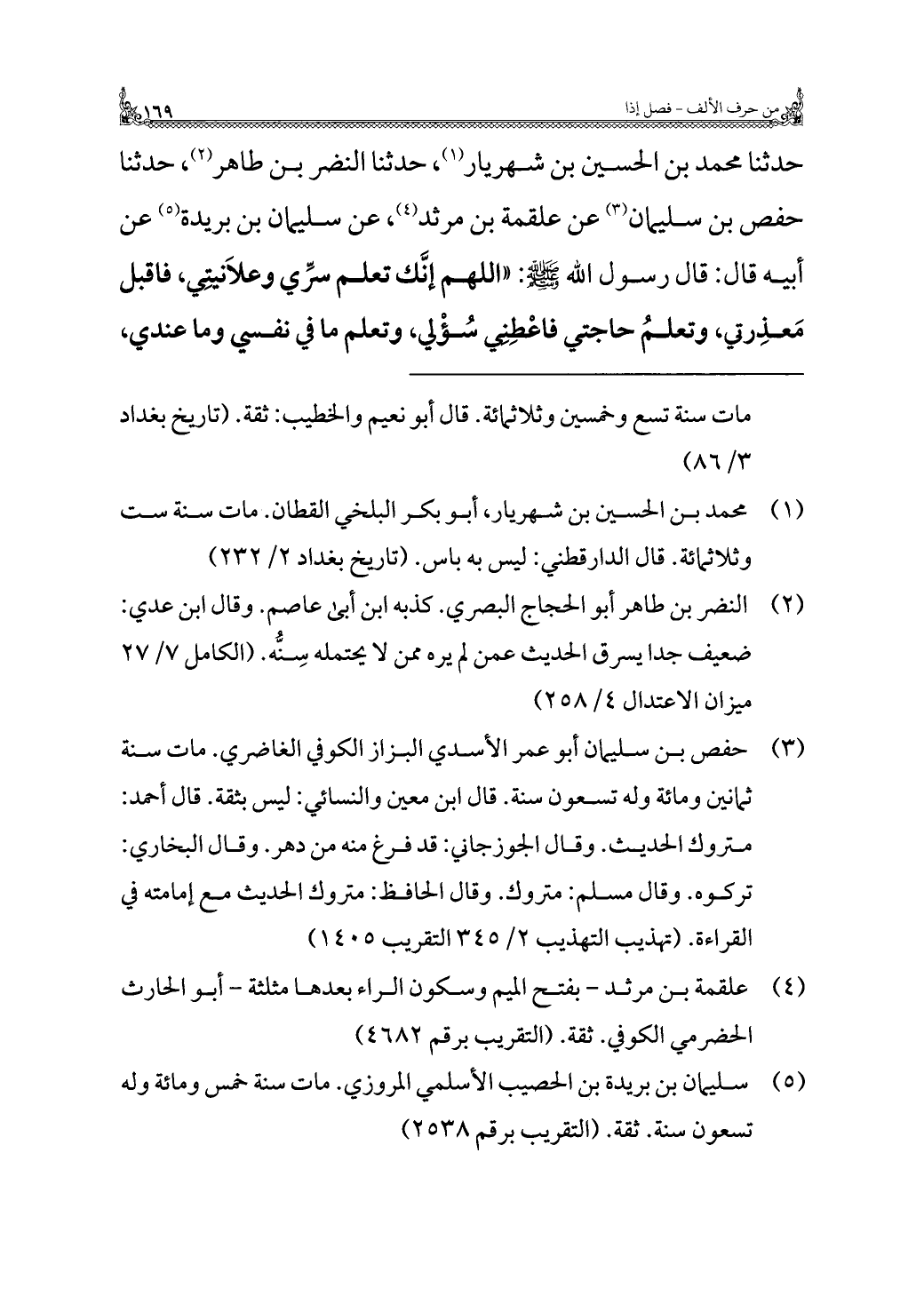 حَدَّثَنَا مُحَمَّد بن الحسين بن شهريار (¬١)، حَدَّثَنَا النَّضْرِ بن طاهر (¬٢)، حَدَّثَنَا حفص بن سليمان (¬٣) عن علقمة بن مرثد (¬٤)، عن سليمان بن بُرَيْدَة (¬٥) عن أبِيهِ قَالَ: قَالَ رسول الله - صَلَّى اللهُ عَلَيْهِ وَسَلَّمَ -: "اللَّهُمَّ إنَّك تعلم سرِّي وعلَانيتِي، فاقبل مَعذِرتي، وتعلمُ حاجتي فاعْطِنِي سُؤْلي، وتعلم ما في نفسي وما عندي،
