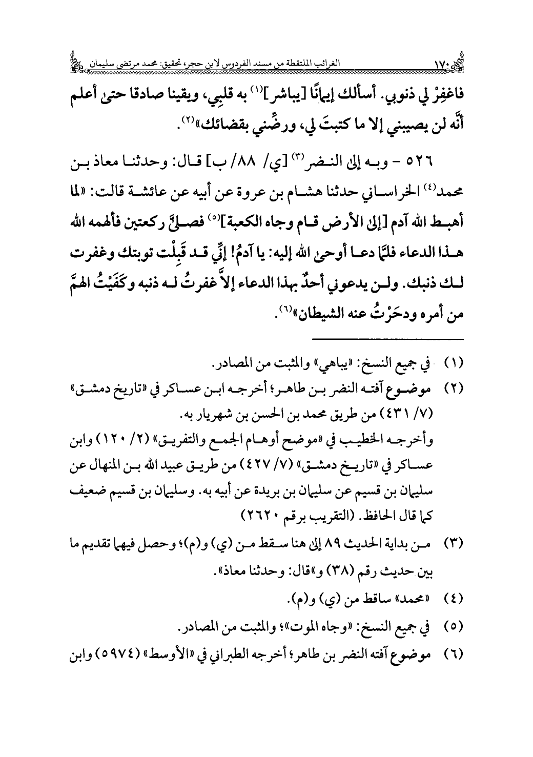 ٥٢٦ - وبه إِلَى النَّضْر (¬٣) قَالَ: وَحَدَّثَنَا معاذ بن مُحَمَّد (¬٤) الخراساني حَدَّثَنَا هشام بن عروة عن أبِيهِ عن عَائِشَة قالت: "لما أهبط الله آدم [إِلَى الأرض قام وجاه الكعبة] (¬٥) فصليَّ ركعتين فألهمه الله هذا الدعاء فلمَّا دعا أوحى الله إليه: يا آدمُ! إنِّي قد قَبِلْت توبتك وغفرت لك ذنبك. ولن يدعوني أحدٌ بهذا الدعاء إلَّا غفرتُ له ذنبه وكَفَيْتُ الهمَّ من أمره ودحَرْتُ عنه الشيطان" (¬٦).