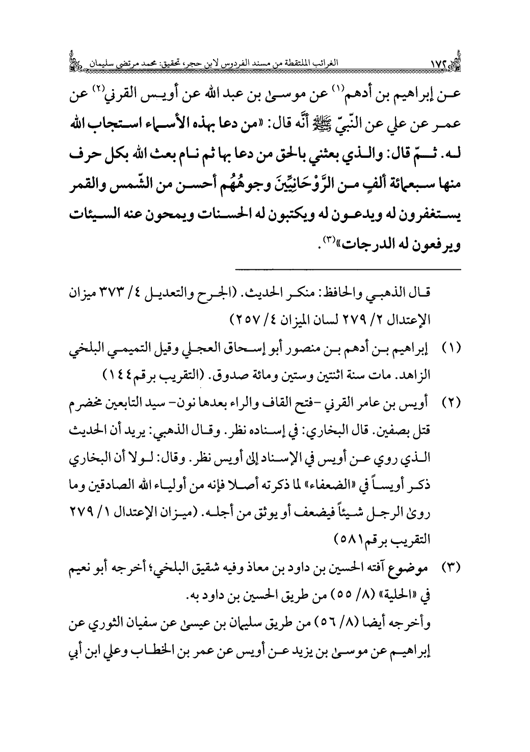 عن إبْرَاهِيم بن أدهم (¬١) عن موسى بن عَبْد الله عن أويس القرني (¬٢) عن عمر عن علي عن النّبيّ - صَلَّى اللهُ عَلَيْهِ وَسَلَّمَ - أنَّه قَالَ: "من دعا بهذه الأسماء استجاب الله له. ثمّ قَالَ: والذي بعثني بالحق من دعا بها ثم نام بعث الله بكل حرف منها سبعمائة ألفٍ من الرَّوْحَانِيِّينَ وجوهُهُم أحسن من الشّمس والقمر يستغفرون له ويدعون له ويكتبون له الحسنات ويمحون عنه السيئات ويرفعون له الدرجات" (¬٣).