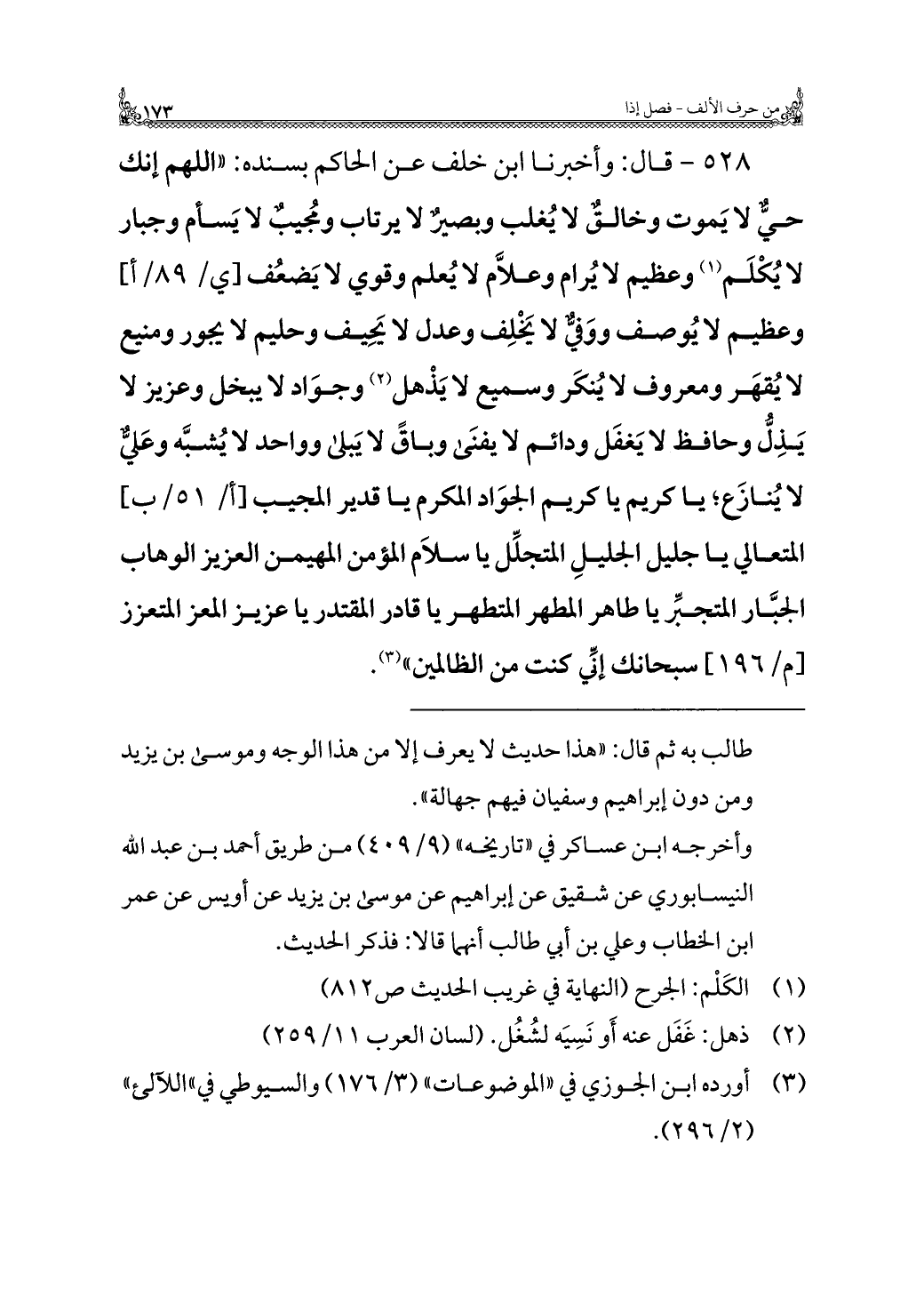 ٥٢٨ - قَالَ: وأخبرنا ابن خلف عن الحاكم بسنده: "اللَّهُمَّ إنك حيٌّ لا يَموت وخالقٌ لا يُغلب وبصيرٌ لا يرتاب ومُجيبٌ لا يَسأم وجبار لا يُكْلَم (¬١) وعظيم لا يُرام وعلَّام لا يُعلم وقوي لا يَضعُف وعظيم لا يُوصف ووَفيٌّ لا يَخْلِف وعدل لا يَحِيف وحليم لا يجور ومنيع لا يُقهَر ومعروف لا يُنكَر وسميع لا يَذْهل (¬٢) وجوَاد لا يبخل وعزيز لا يَذِلُّ وحافظ لا يَغفَل ودائم لا يفنَى وباق لا يَبلى وواحد لا يُشبَّه وعَليٌّ لا يُنازَع؛ يا كريم يا كريم الجوَاد المكرم يا قدير المجيب المتعالي يا جليل الجليلِ المتجلِّل يا سلَام المؤمن المهيمن العزيز الوهاب الجبَّار المتجبِّر يا طاهر المطهر المتطهر يا قادر المقتدر يا عزيز المعز المتعزز سبحانك إنِّي كنت من الظالمين" (¬٣).