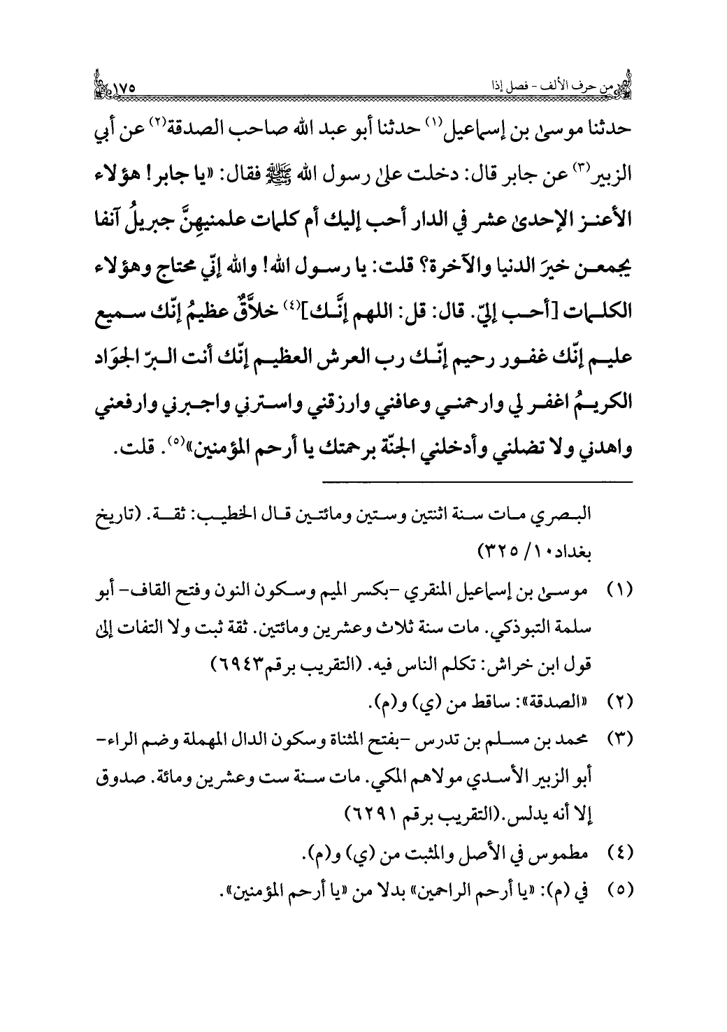 حَدَّثَنَا موسى بن إسماعيل (¬١) حَدَّثَنَا أَبُو عَبْد الله صاحب الصدقة (¬٢) عن أَبِي الزبير (¬٣) عن جابر قَالَ: دخلت على رسول الله - صَلَّى اللهُ عَلَيْهِ وَسَلَّمَ - فقال: "يا جابر! هؤلاء الأعنز الأحدى عشر في الدار أحب إليك أم كلمات علمنيهِنَّ جبريلُ آنفًا يجمعن خيرَ الدنيا والآخرة؟ قلت: يا رسول الله! والله إنّي محتاج وهؤلاء الكلمات [أحب إليّ. قَالَ: قل: اللَّهُمَّ إنَّك] (¬٤) خلَّاقٌ عظيمُ إنّك سميع عليم إنّك غفور رحيم إنّك رب العرش العظيم إنّك أنت البرّ الجوَاد الكريمُ اغفر لي وارحمني وعافني وارزقني واسترني واجبرني وارفعني واهدني وَلَا تضلني وأدخلني الجنّة برحمتك يا أرحم المؤمنين" (¬٥). قلت.