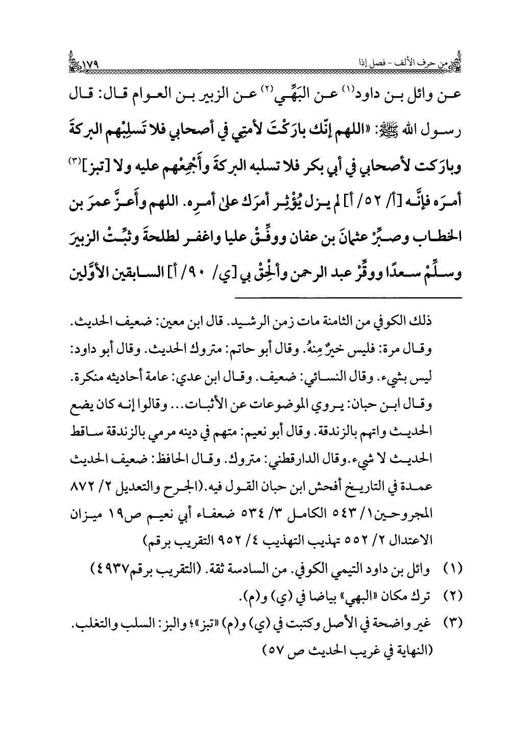 عن وائل بن داود (¬١) عن البَهِّي (¬٢) عن الزبير بن العوام قَالَ: قَالَ رسول الله - صَلَّى اللهُ عَلَيْهِ وَسَلَّمَ -: "اللَّهُمَّ إنّك بارَكْتَ لأمتِي في أصحابي فلا تَسلِبْهم البركةَ وبارَكت لأصحابي في أَبِي بكر فلا تسلبه البركةَ وأَجْمِعْهم عليه وَلَا [تبز] (¬٣) أمرَه فإنَّه لم يزل يُؤْثِر أمرَك على أمرِه. اللَّهُمَّ وأَعزَّ عمرَ بن الخطاب وصبِّرْ عثمانَ بن عفان ووفِّقْ عليًا واغفر لطلحةَ وثبِّتْ الزبيرَ وسلِّمْ سعدًا ووقِّرْ عَبْدُ الرَّحمن والحقْ بي السابقين الأوَّلين