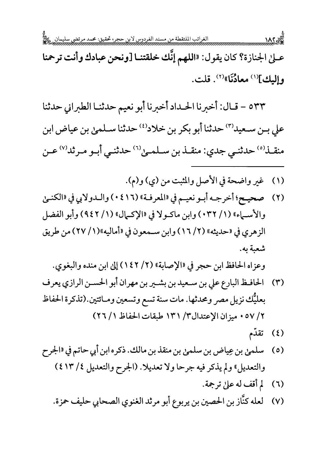 ٥٣٣ - قَالَ: أخبرنا الحداد أخبرنا أَبُو نعيم حَدَّثَنَا الطبراني حَدَّثَنَا علي بن سَعِيد (¬٣) حَدَّثَنَا أَبُو بكر بن خلاد (¬٤) حَدَّثَنَا سلمى بن عياض بن منقذ (¬٥) حدّثني جدي: منقذ بن سلمى (¬٦) حدّثني أَبُو مرثد (¬٧) عن