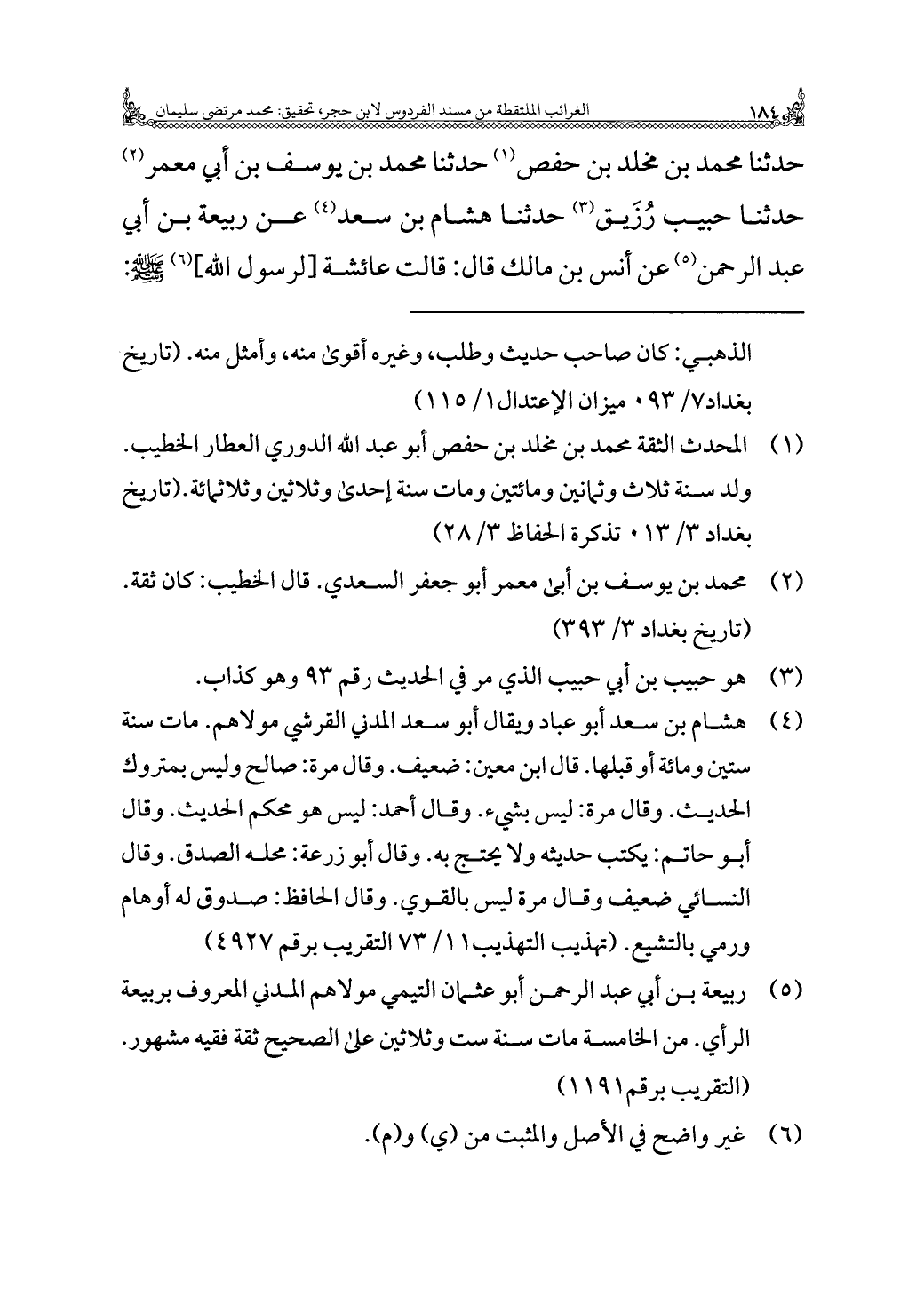 حَدَّثَنَا مُحَمَّد بن مخلد بن حفص (¬١) حَدَّثَنَا مُحَمَّد بن يوسف بن أَبِي مَعْمَر (¬٢) حَدَّثَنَا حبيب رُزَيق (¬٣) حَدَّثَنَا هشام بن سعد (¬٤) عن ربيعَة بن أَبِي عَبْدُ الرَّحمن (¬٥) عن أنس بن مالك قَالَ: قالت عَائِشَة [لرسول الله] (¬٦) - صَلَّى اللهُ عَلَيْهِ وَسَلَّمَ -: