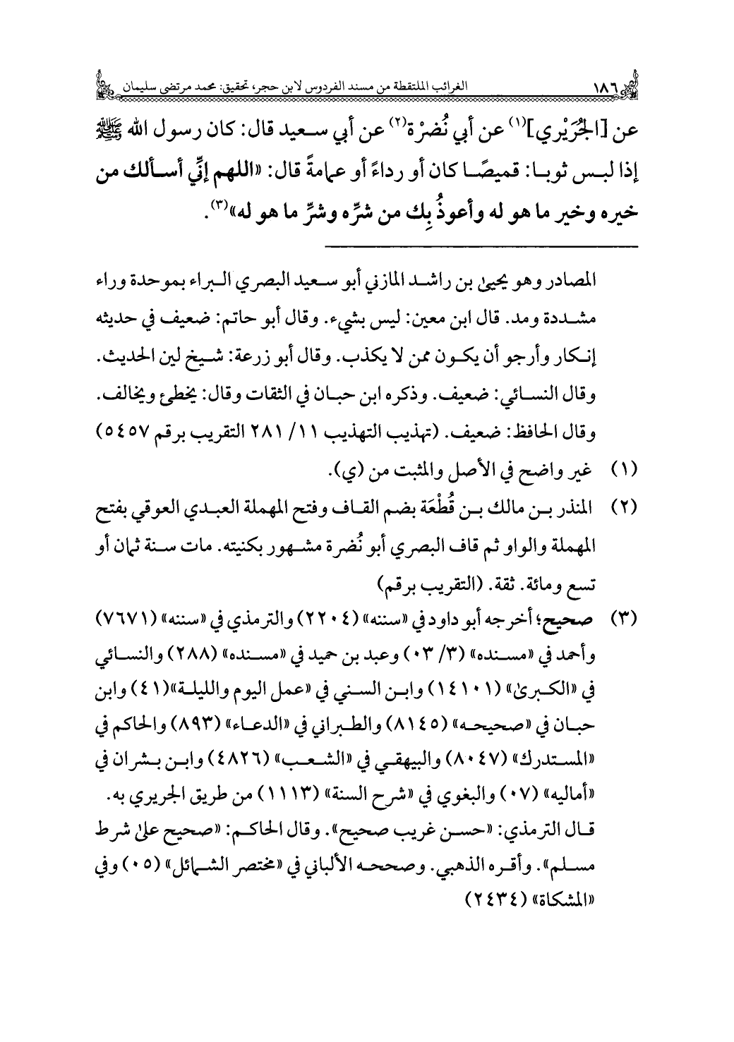 عن [الجُرَيْري] (¬١) عن أَبِي نُضرْة (¬٢) عن أَبِي سَعِيد قَالَ: كان رسول الله - صَلَّى اللهُ عَلَيْهِ وَسَلَّمَ - إِذَا لبس ثوبا: قميصًا كان أو رداءً أو عمامةً قَالَ: "اللَّهُمَّ إّني أسألك من خيره وخير ما هو له وأعوذُ بِك من شرِّه وشرِّ ما هو له" (¬٣).