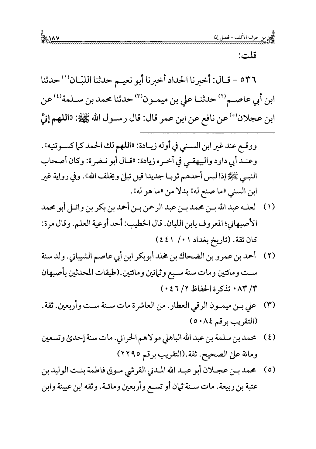 ٥٣٦ - قَالَ: أخبرنا الحداد أخبرنا أَبُو نعيم حَدَّثَنَا اللبّان (¬١) حَدَّثَنَا ابن أَبِي عاصم (¬٢) حَدَّثَنَا علي بن ميمون (¬٣) حَدَّثَنَا مُحَمَّد بن سَلَمَة (¬٤) عن ابن عجلان (¬٥) عن نافع عن ابن عمر قَالَ: قَالَ رسول الله - صَلَّى اللهُ عَلَيْهِ وَسَلَّمَ -: "اللَّهُمَّ إنِّي