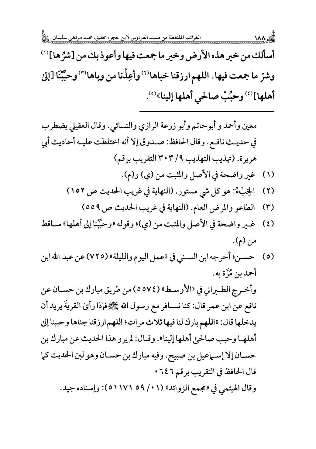 وأخرج الطبراني في "الأوسط" (٥٥٧٤) من طريق مبارك بن حسان عن نافع عن ابن عمر قَالَ: كنا نسافر مع رسول الله - صَلَّى اللهُ عَلَيْهِ وَسَلَّمَ - فإذا رأى القريةَ يريد أن يدخلها قَالَ: "اللَّهُمَّ بارك لنا فيها ثلاث مرات؛ اللَّهُمَّ ارزقنا جناها وحببنا إِلَى أهلها وحبب صالحي أهلها إلينا". وقال: لم يرو هذا الحديث عن مبارك بن حسان إلَّا إسماعيل بن صبيح. وفيه مبارك بن حسان وهو لين الحديث كما قَالَ الحافظ في التقريب برقم ٦٤٦.