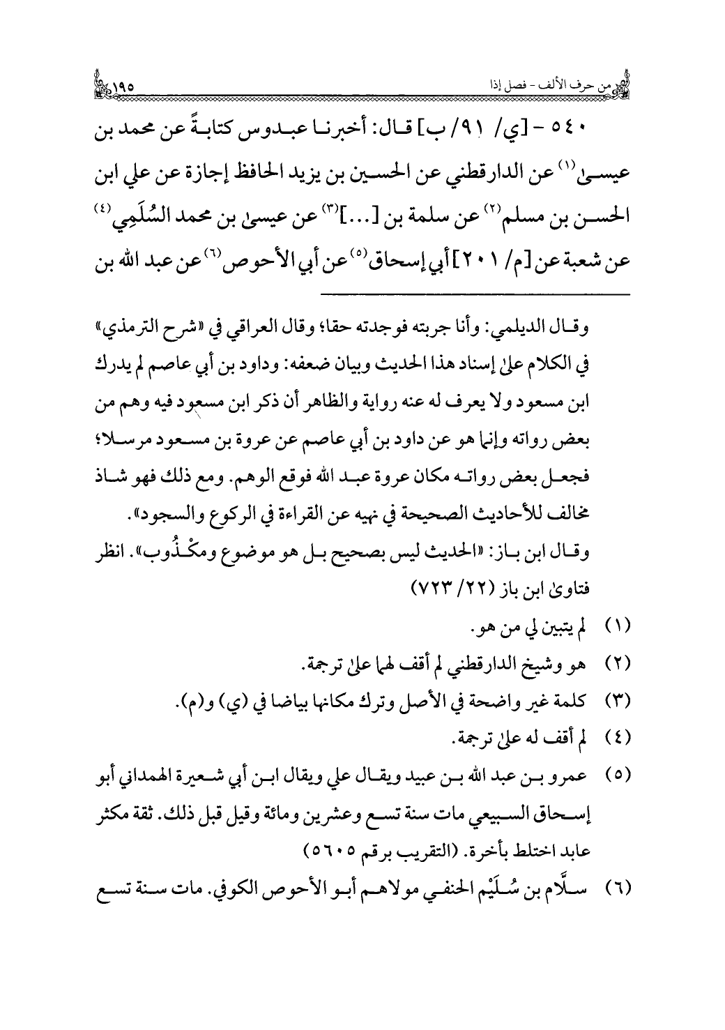 ٥٤٠ - قَالَ: أخبرنا عبدوس كتابةً عن مُحَمَّد بن عِيسَى (¬١) عن الدارقطني عن الحسين بن يزيد الحافظ إجازة عن علي بن الحسن بن مسلم (¬٢) عن سَلَمَة بن [ ... ] (¬٣) عن عِيسَى بن مُحَمَّد السُلَمِي (¬٤) عن شُعْبَة عن أَبِي إسحاق (¬٥) عن أَبِي الأحوص (¬٦) عن عَبْدُ الله بن