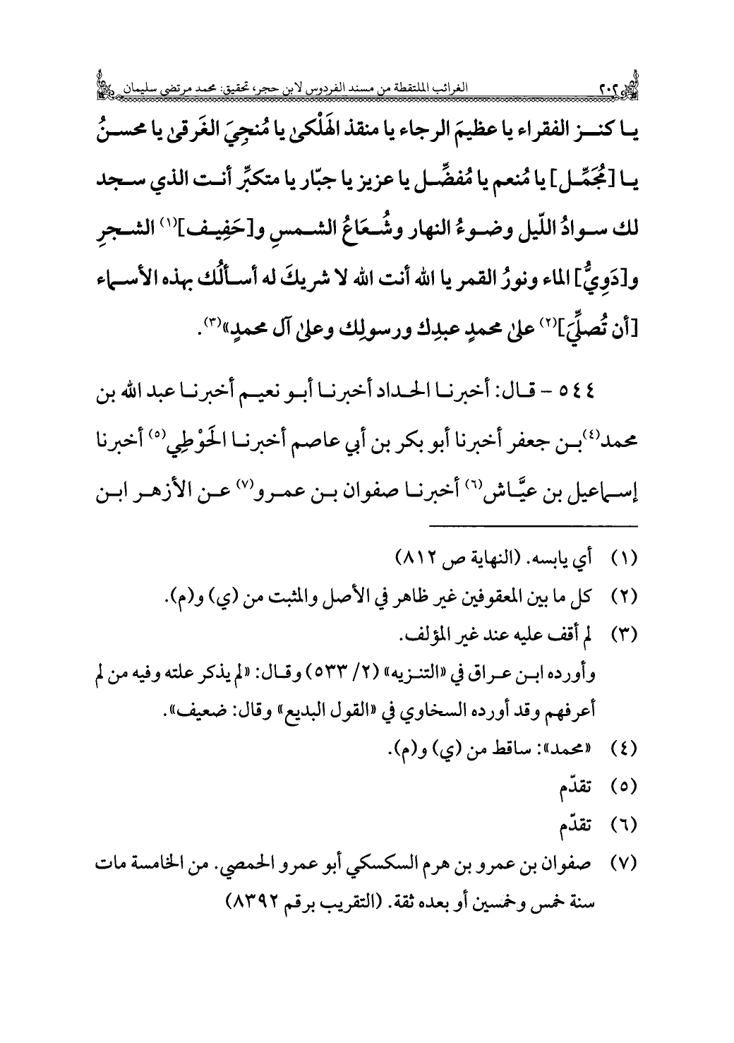 ٥٤٤ - قَالَ: أخبرنا الحداد أخبرنا أَبُو نعيم أخبرنا عَبْد الله بن مُحَمَّد (¬٤) بن جَعْفَر أخبرنا أَبُو بكر بن أَبِي عاصم أخبرنا الحَوْطِي (¬٥) أخبرنا إسماعيل بن عيَّاش (¬٦) أخبرنا صفوان بن عَمْرو (¬٧) عن الأزهر ابن