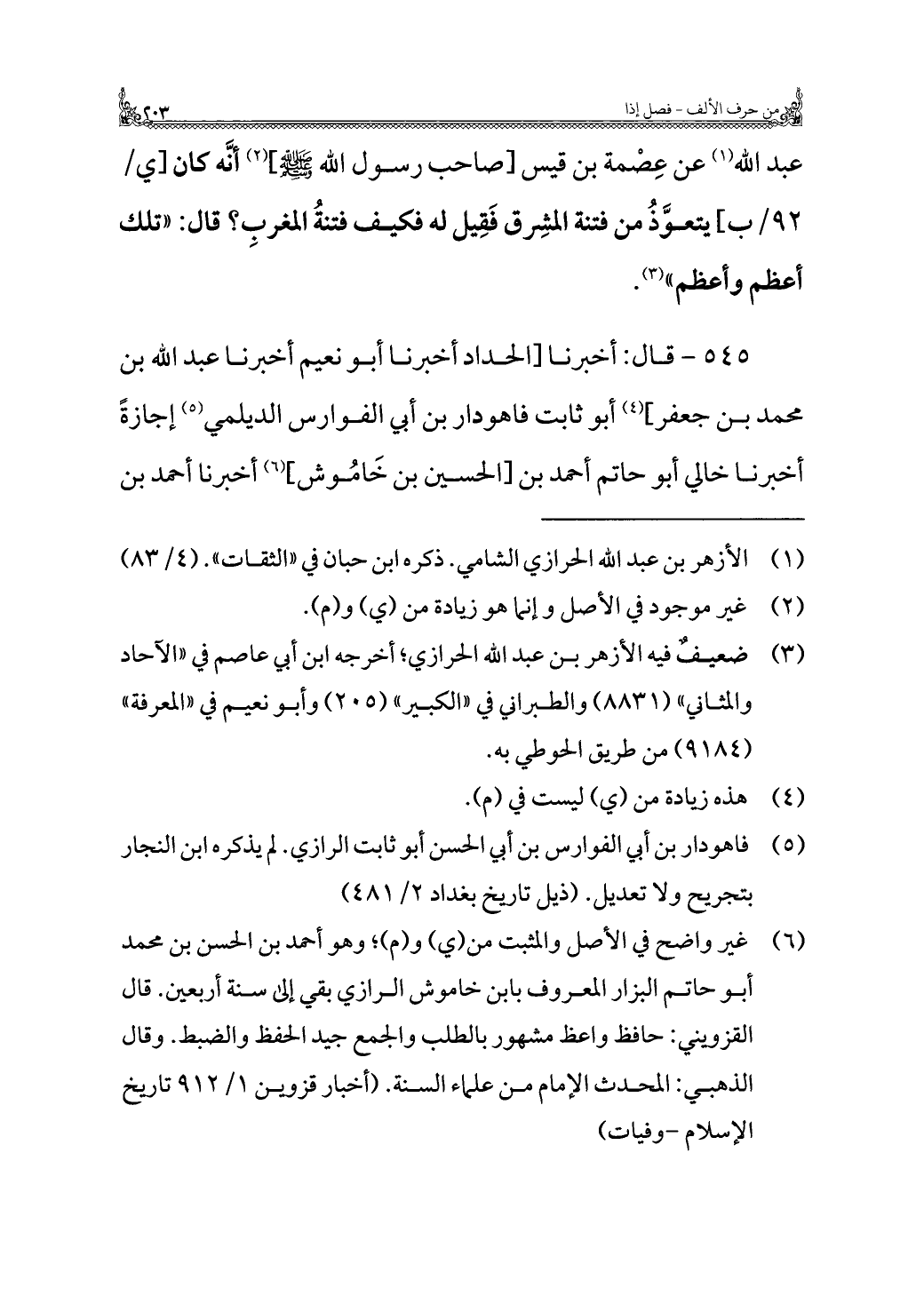 (¬٣) ضعيفٌ فيه الأزهر بن عَبْد الله الحرازي؛ أخرجه ابن أَبِي عاصم في "الآحاد والمثاني" (٨٨٣١) والطبراني في "الكبير" (٢٠٥) وأبو نعيم في "المعرفة" (٩١٨٤) من طريق الحوطي به.
