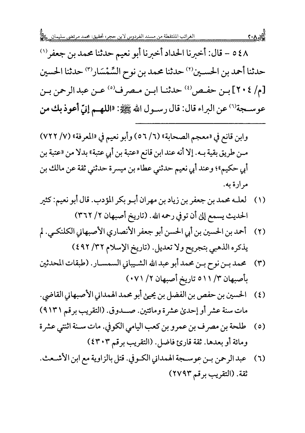 ٥٤٨ - قَالَ: أخبرنا الحداد أخبرنا أَبُو نعيم حَدَّثَنَا مُحَمَّد بن جَعْفَر (¬١) حَدَّثَنَا أحمد بن الحسين (¬٢) حَدَّثَنَا مُحَمَّد بن نوح السِّمْسَار (¬٣) حَدَّثَنَا الحسين بن حفص (¬٤) حَدَّثَنَا ابن مصرف (¬٥) عن عَبْد الرَّحمن بن عوسجة (¬٦) عن البراء قَالَ: قَالَ رسول الله - صَلَّى اللهُ عَلَيْهِ وَسَلَّمَ -: "اللَّهُمَّ إنِّي أعوذ بك من