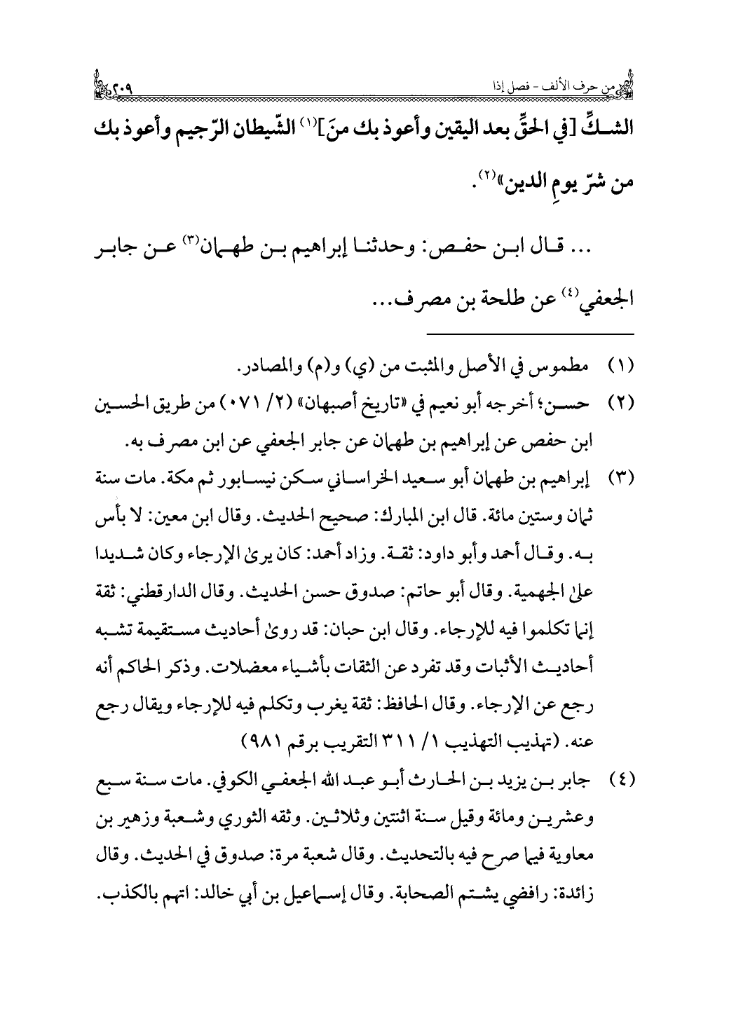 ... قَالَ ابن حفص: وَحَدَّثَنَا إبْرَاهِيم بن طهمان (¬٣) عن جابر الجعفي (¬٤) عن طلحة بن مصرف ...