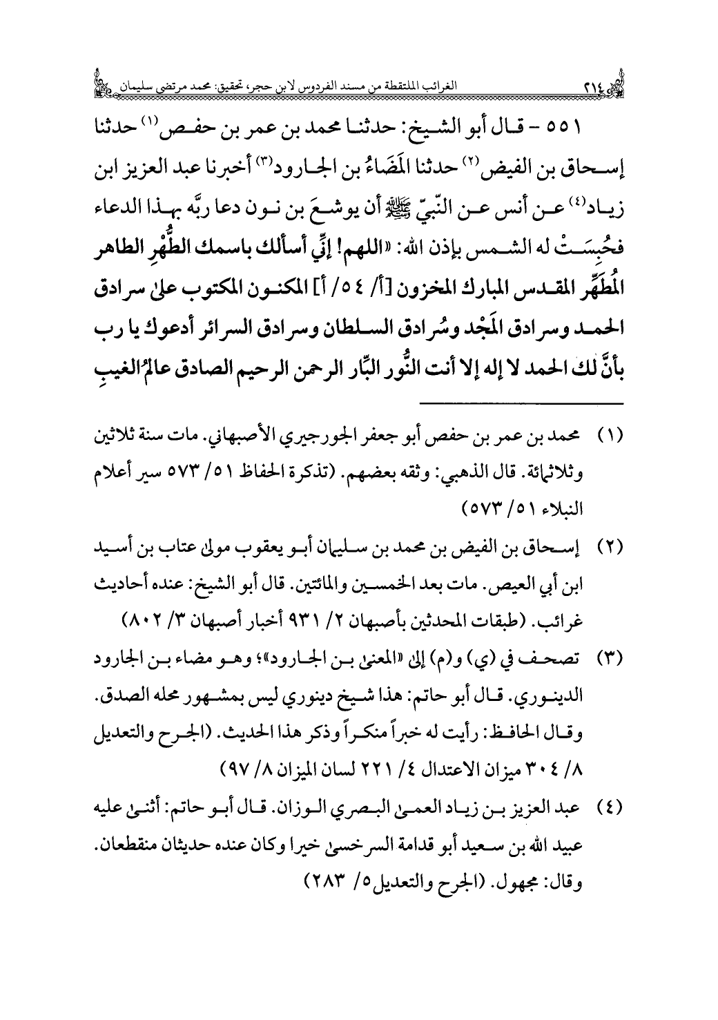 ٥٥١ - قَالَ أَبُو الشيخ: حَدَّثَنَا مُحَمَّد بن عمر بن حفص (¬١) حَدَّثَنَا إسحاق بن الفيض (¬٢) حَدَّثَنَا المَضَاءُ بن الجارود (¬٣) أخبرنا عَبْد العزيز بن زياد (¬٤) عن أنس عن النّبيّ - صَلَّى اللهُ عَلَيْهِ وَسَلَّمَ - أن يوشعَ بن نون دعا ربَّه بهذا الدعاء فحُبسَتْ له الشمس بإذن الله: "اللَّهُمَّ! إنِّي أسألك باسمك الطُّهْرِ الطاهر المُطَهِّر المقدس المبارك المخزون، المكنون المكتوب على سرادق الحمد وسرادق المَجْد وسُرادق السلطان وسرادق السرائر أدعوك يا رب بأنَّ لك الحمد لا إله إلَّا أنت النُّور البَّار الرَّحمن الرحيم الصادق عالمُ الغيبِ