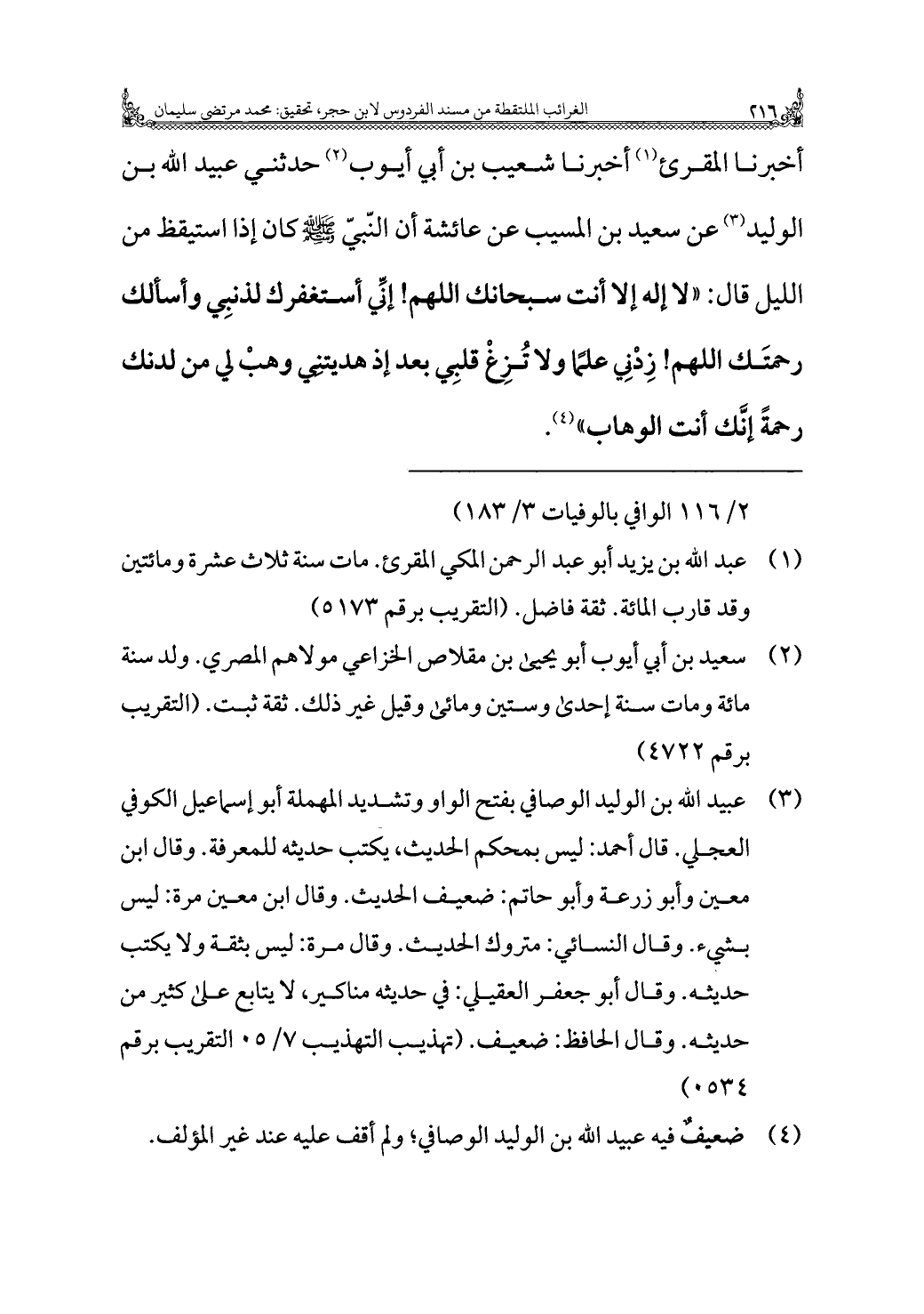 أخبرنا المقرئ (¬١) أخبرنا شعيب بن أَبِي أَيُّوب (¬٢) حدّثني عبيد الله بن الوليد (¬٣) عن سَعِيد بن المسيب عن عَائِشَة أن النّبيّ - صَلَّى اللهُ عَلَيْهِ وَسَلَّمَ - كان إِذَا اسْتَيقَظَ من الليل قَالَ: "لا إله إلَّا أنت سبحانك اللَّهُمَّ! إنِّي أستغفرك لذنبِي وأسألك رحمتَك اللَّهُمَّ! زِدْنِي علمًا وَلَا تُزِغْ قلبِي بعد إذ هديتيي وهبْ لي من لدنك رحمةً إنَّك أنت الوهاب" (¬٤).