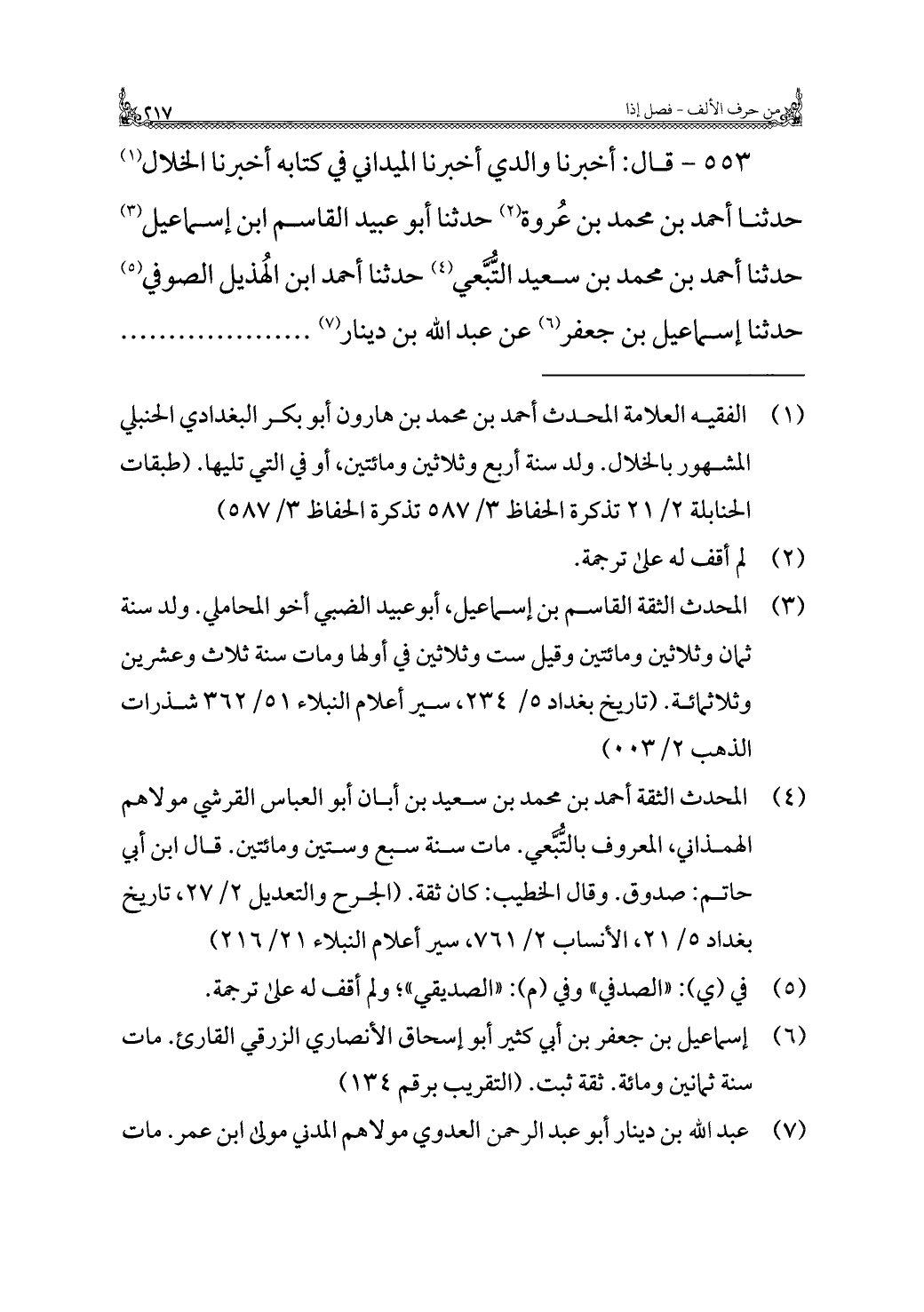 (¬١) الفقيه العلامة المحدث أحمد بن مُحَمَّد بن هارون أَبُو بكر البغدادي الحنبلي المشهور بالخلال. ولد سنة أربع وثلاثين ومائتين، أو في التي تليها. (طبقات الحنابلة ٢/ ٢١ تذكرة الحفّاظ ٣/ ٥٨٧ تذكرة الحفّاظ ٣/ ٥٨٧)