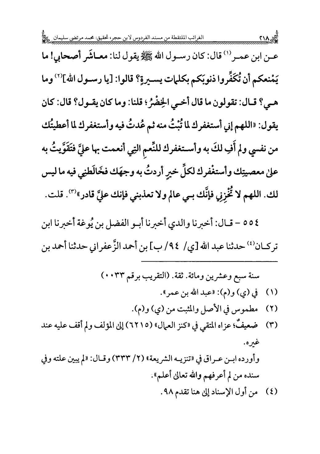 عن ابن عمر (¬١) قَالَ: كان رسول الله - صَلَّى اللهُ عَلَيْهِ وَسَلَّمَ - يقول لنا: معاشَر أصحابي! ما يَمْنعكم أن تُكَفِّروا ذنوبَكم بكلمات يسيرةٍ؟ قالوا: [يا رسول الله] (¬٢) وما هي؟ قَالَ: تقولون ما قَالَ أخي الخِضْرُ؛ قلنا: وما كان يقول؟ قَالَ: كان يقول: "اللَّهُمَّ إني أستغفرك لما تُبْتُ منه ثم عُدتُ فيه وأستغفرك لما أعطيتُك من نفسي ولم أَفِ لكَ به وأستغفرك للنِّعمِ التِي أنعمت بها عليَّ فتَقَوَّيتُ به على معصيتِك وأستغْفرك لكلِّ خيرٍ أردتُ به وجهَك فخَالَطنِي فيه ما ليس لك. اللَّهُمَّ لا تُخْزِنِي فإنَّك بي عالم وَلَا تعذبني فإنك عليَّ قادر" (¬٣). قلت.