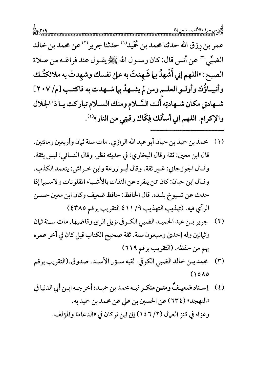 عمر بن رِزق الله حَدَّثَنَا مُحَمَّد بن حُمَيد (¬١) حَدَّثَنَا جرير (¬٢) عن مُحَمَّد بن خالد الضبِّي (¬٣) عن أنس قَالَ: كان رسول الله - صَلَّى اللهُ عَلَيْهِ وَسَلَّمَ - يقول عند فراغه من صلاة الصبح: "اللَّهُمَّ إني أَشْهدُ بما شَهِدتَ به على نفسك وشهِدتْ به ملائكتُك وأنبياؤُك وأولو العلمِ ومن لم يشهدْ بما شهدت به فاكتب، شهادتي مكان شهادتِه أنت السَّلام ومنك السلام تباركت يا ذا الجلال والإكرام. اللَّهُمَّ إني أسألك فِكَاك رقبتي من النار" (¬٤).