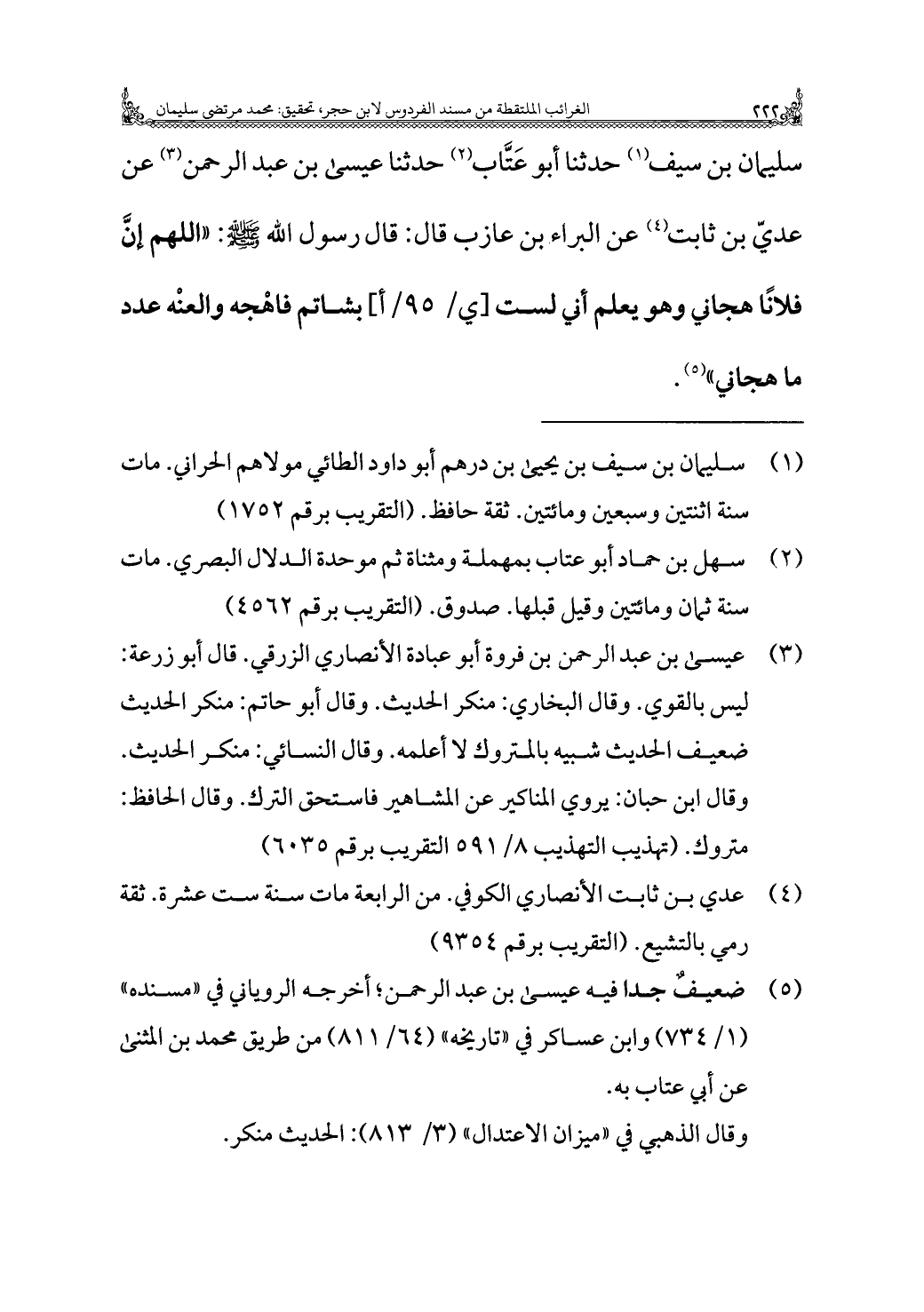 سليمان بن سيف (¬١) حَدَّثَنَا أَبُو عَتَّاب (¬٢) حَدَّثَنَا عِيسَى بن عَبْد الرَّحمن (¬٣) عن عديّ بن ثابت (¬٤) عن البراء بن عازب قَالَ: قَالَ رسول الله - صَلَّى اللهُ عَلَيْهِ وَسَلَّمَ -: "اللَّهُمَّ إنَّ فلانًا هجاني وهو يعلم أني لست بشاتم فاهْجه والعنْه عدد ما هجاني" (¬٥).