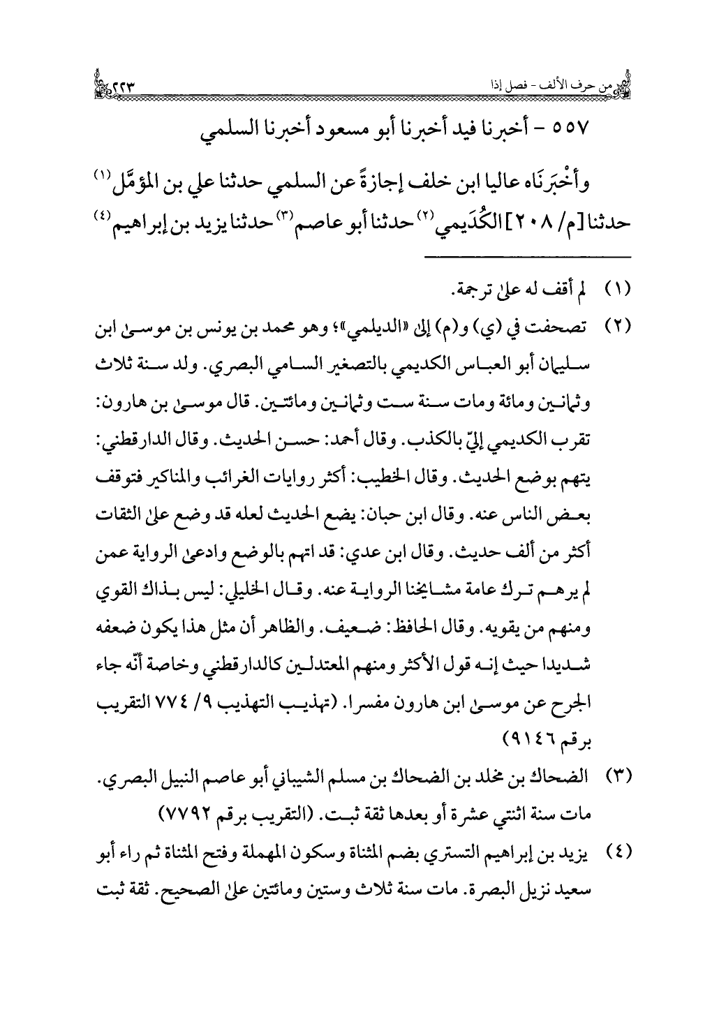 ٥٥٧ - أخبرنا فيد أخبرنا أَبُو مسعود أخبرنا السُّلَمي وأخْبَرنَاه عاليا ابن خلف إجازةً عن السُّلَمي حَدَّثَنَا علي بن المؤمَّل (¬١) حَدَّثَنَا الكُدَيمي (¬٢) حَدَّثَنَا أَبُو عاصم (¬٣) حَدَّثَنَا يزيد بن إبراهيم (¬٤)