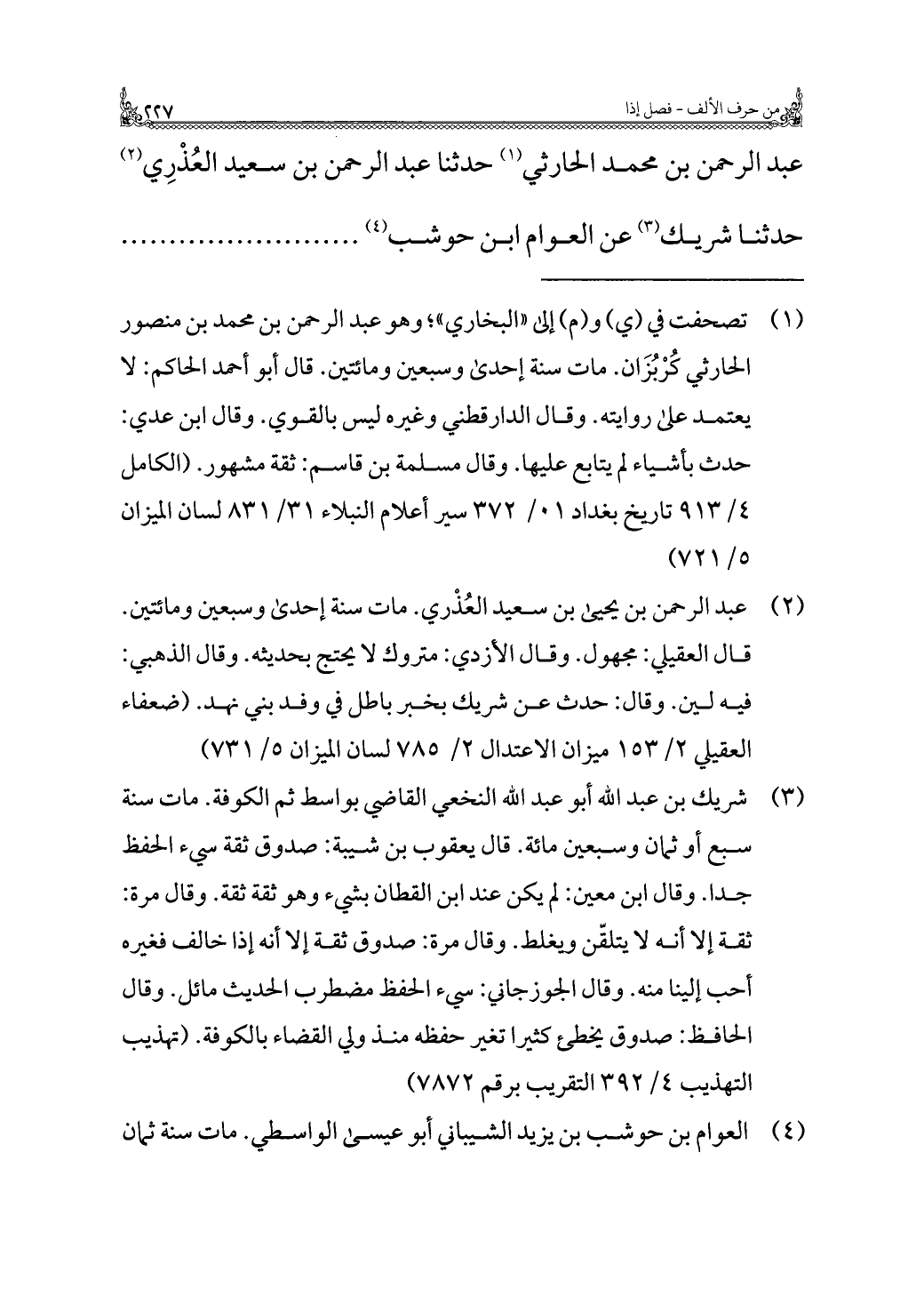 عَبْد الرَّحمن بن مُحَمَّد الحارثي (¬١) حَدَّثَنَا عَبْد الرَّحمن بن سَعِيد العُذْرِي (¬٢) حَدَّثَنَا شريك (¬٣) عن العوام بن حوشب (¬٤)