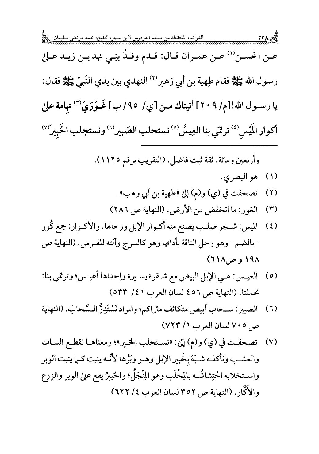 عن الحسن (¬١) عن عمران قَالَ: قدم وفدُ بنِي نهد بن زَيْدِ على رسول الله - صَلَّى اللهُ عَلَيْهِ وَسَلَّمَ - فقام طِهية بن أَبِي زهير (¬٢) النهدي بين يدي النّبيّ - صَلَّى اللهُ عَلَيْهِ وَسَلَّمَ - فقال: يا رسول الله! أتيناك من "غَوْرَي" (¬٣) تهِامة على أكوار المَيْسِ (¬٤) ترتمى بنا العِيسُ (¬٥) نستحلب الصَبير (¬٦) ونستجلب الخَبِيرَ (¬٧)